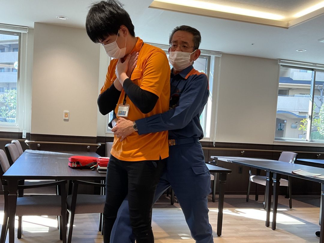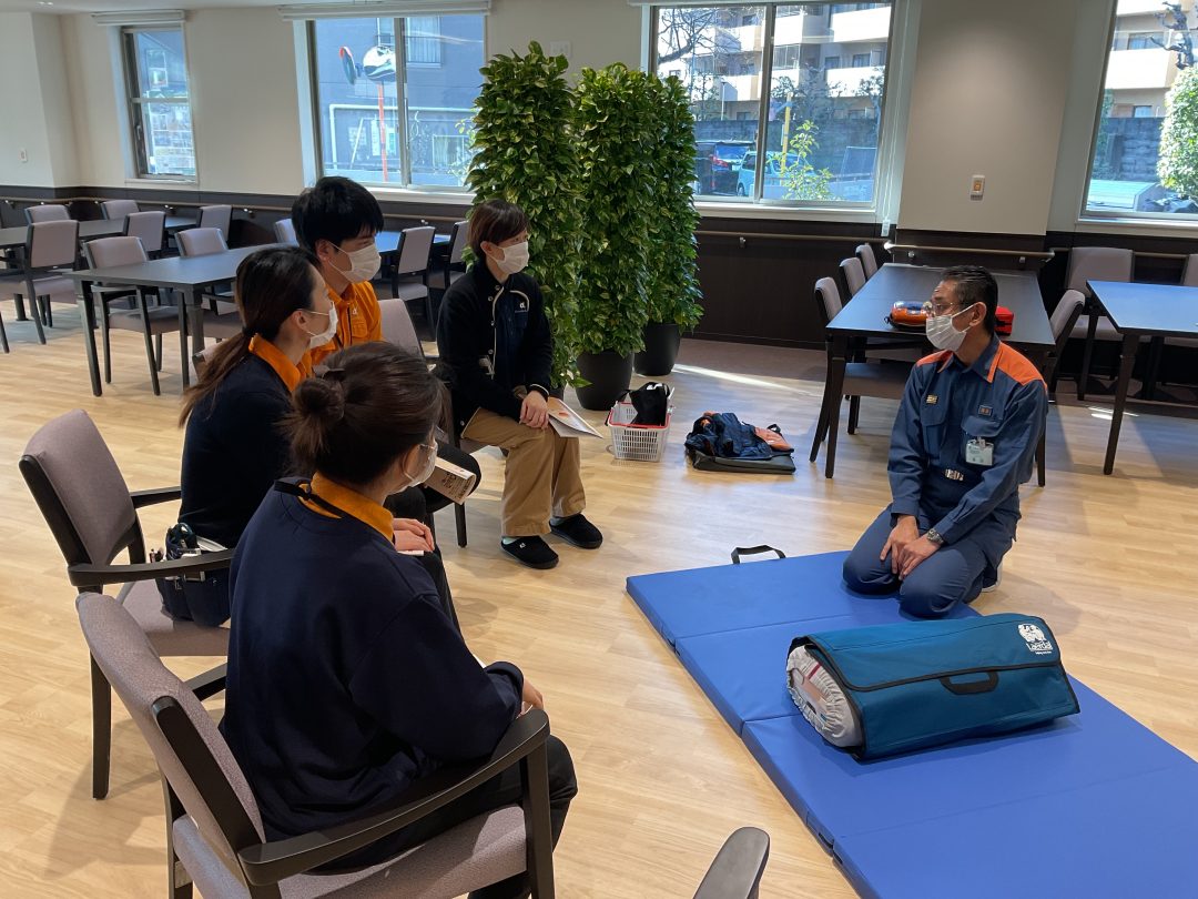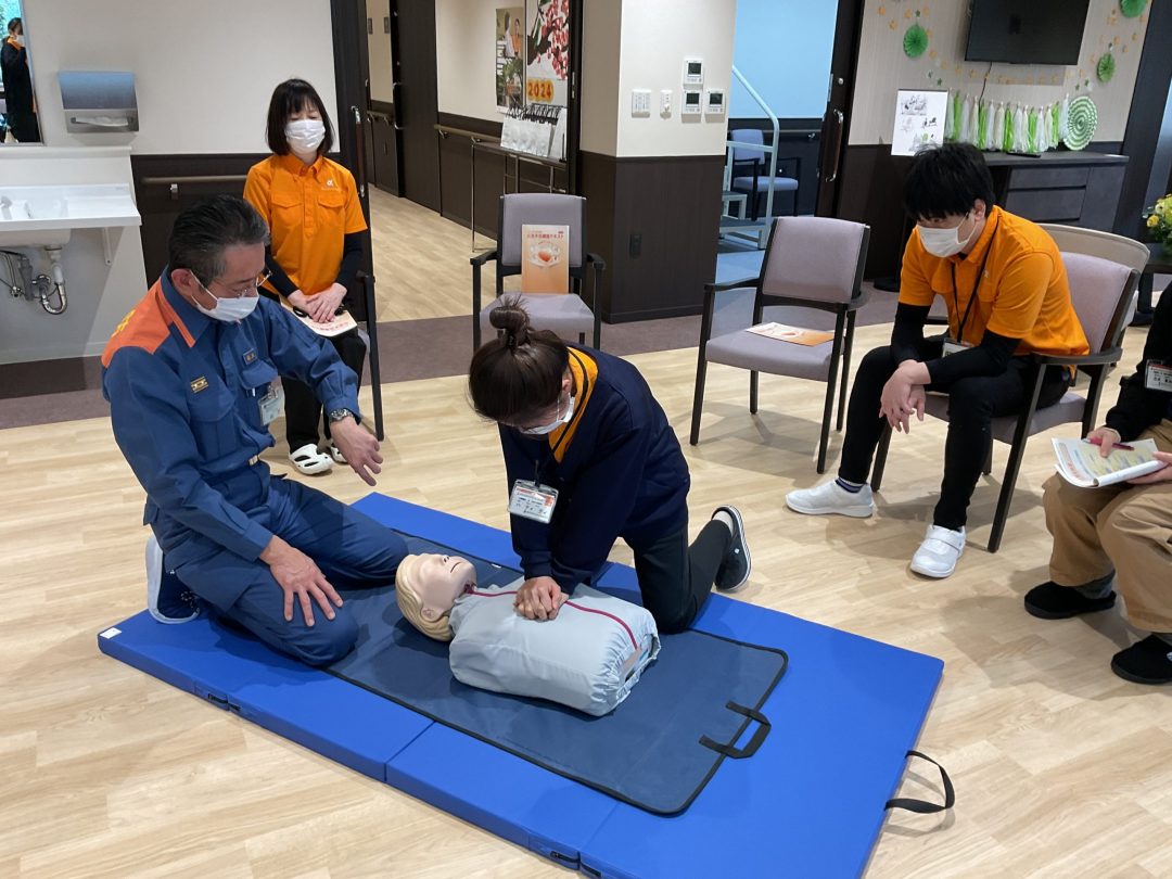 日勤時や夜勤時に介護スタッフが一人でもご入居者の体調変化や異変に対応できるように、吹田市消防局の方を招き救命救急講習を行いました。
