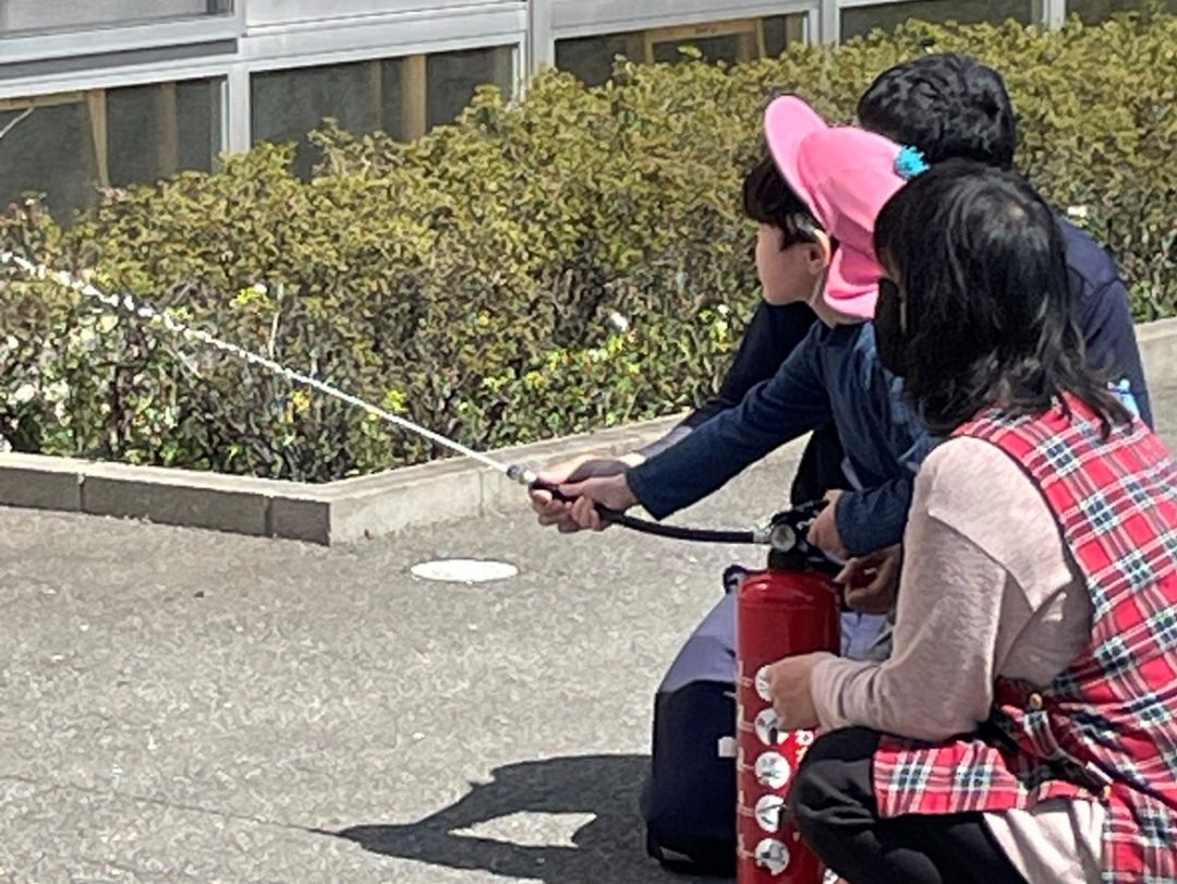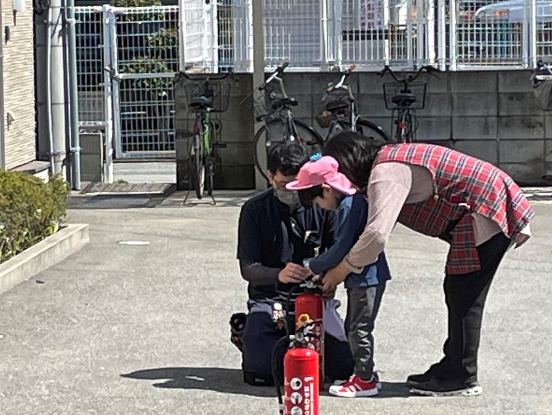 消火器使用方法を説明していただき、園児たちも鎮火訓練を実施。