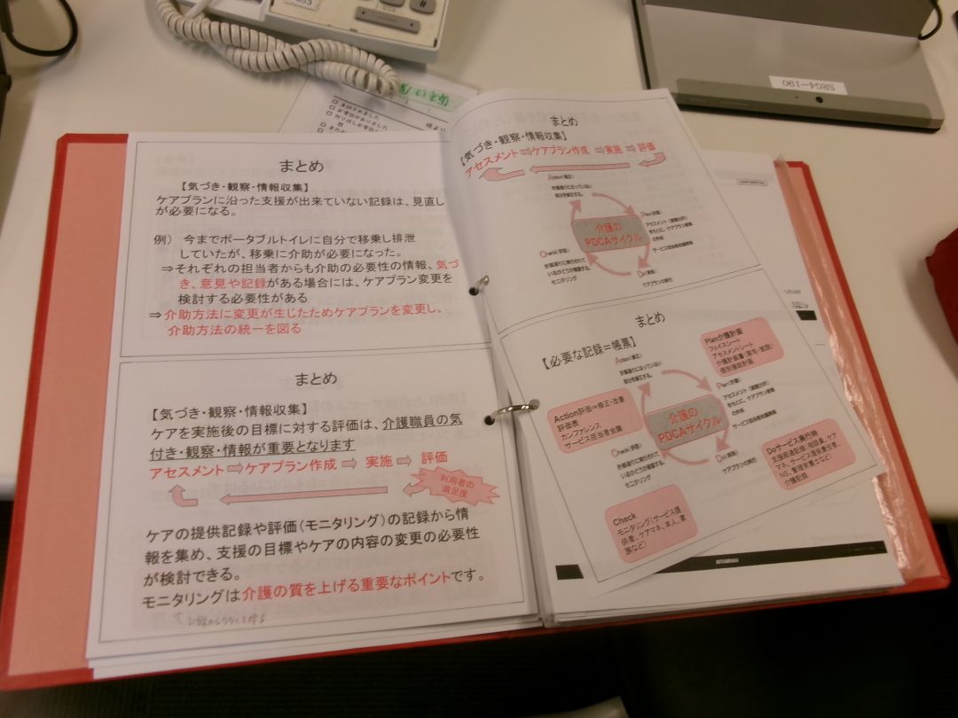 数十人出席されており、いろいろな施設から来ておられるようでした。5W1Hはもちろんのこと、後でご家族の方が読んでもわかりやすいようにと講師の方の説明には納得することばかりでした。