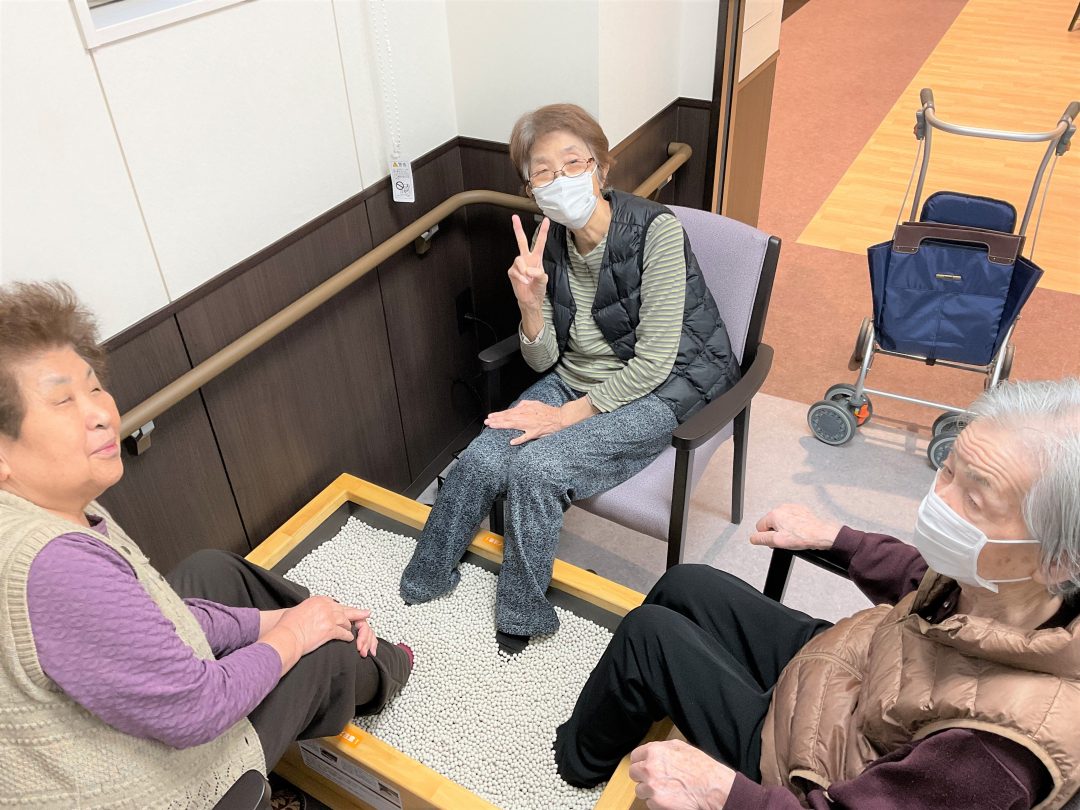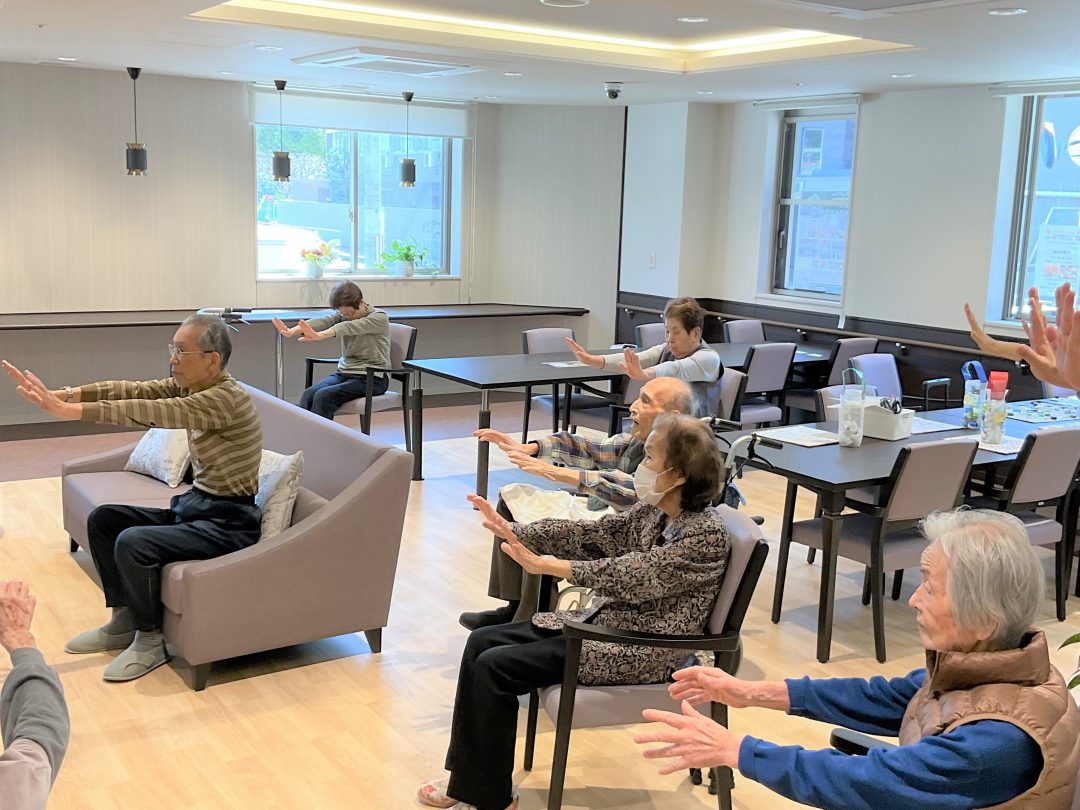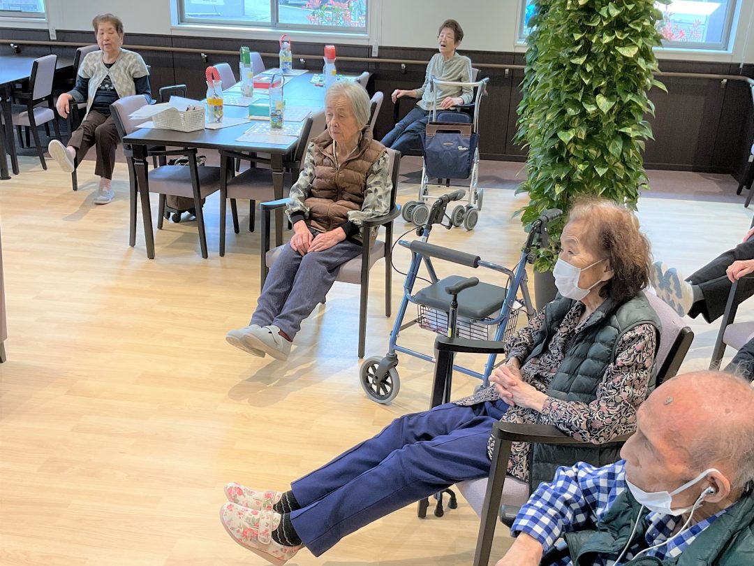 毎日無理のない範囲でのお声掛けにはなりますが、ご参加いただいた方には事務所にて1個ミニお菓子をプレゼントするなど、ご入居者がやりがいをもって楽しくご参加いただけるようメニュー作りをしてくれました。
