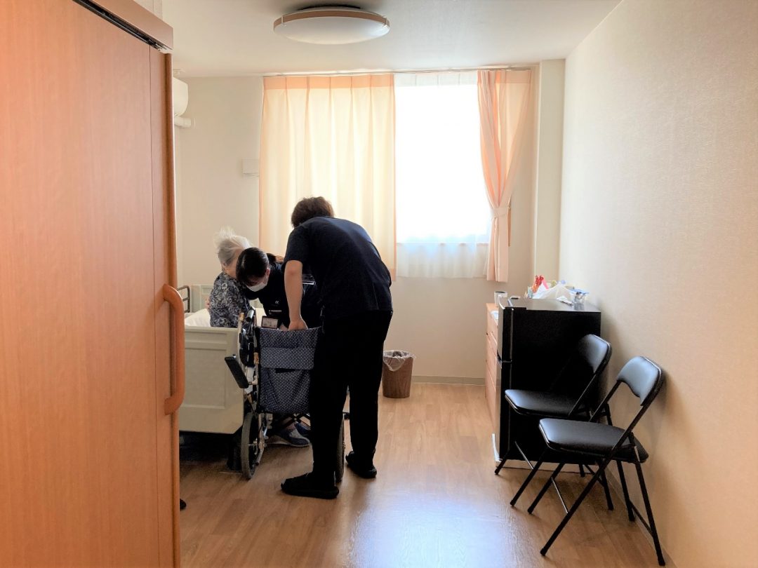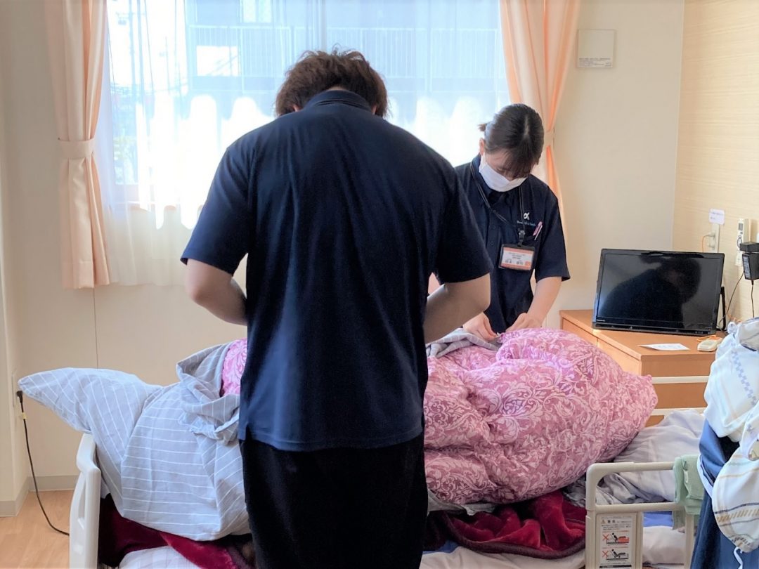 ご入居者と共に行う居室掃除では「洗ってあるシーツはここに入ってますよ」などひとりで訪問サービスに入っても困らないように細かい情報まで共有していました。