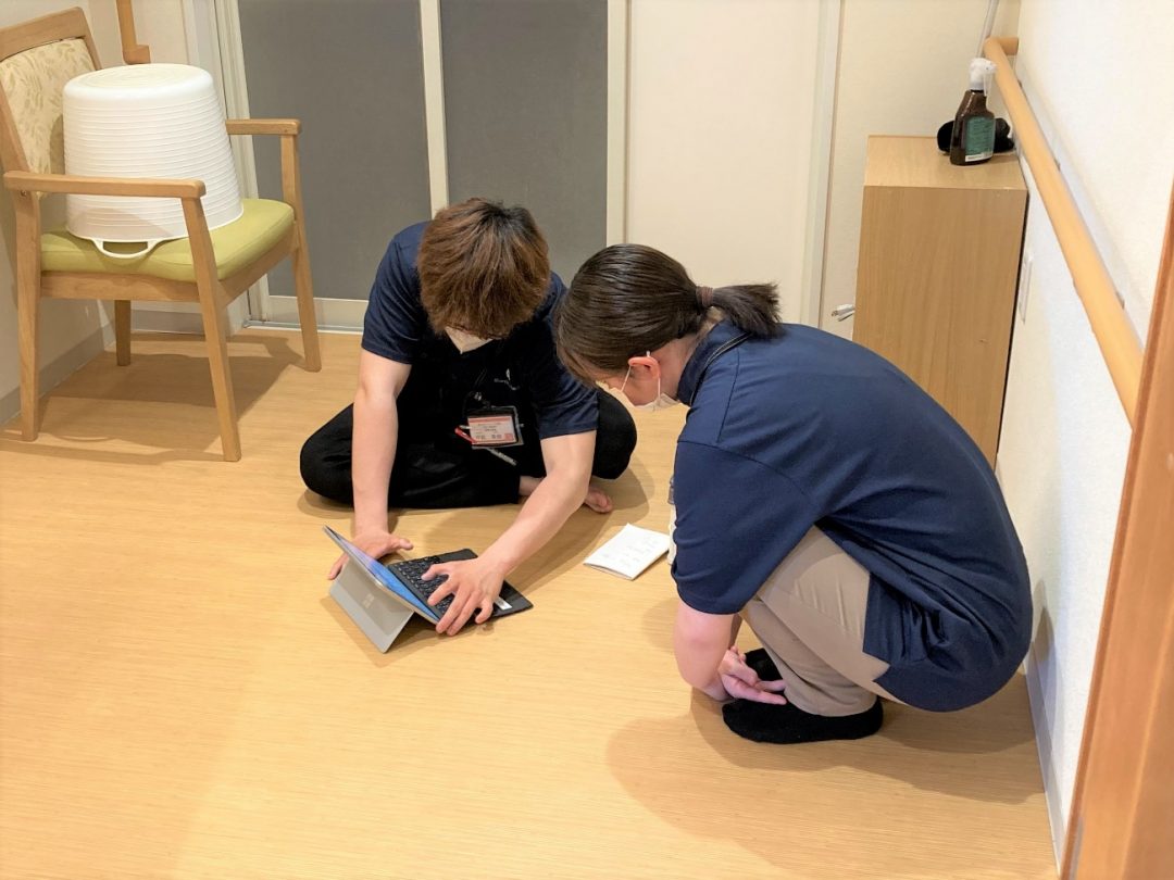 入浴介助の後、訪問サービスの内容の入力もしっかり指導していました。