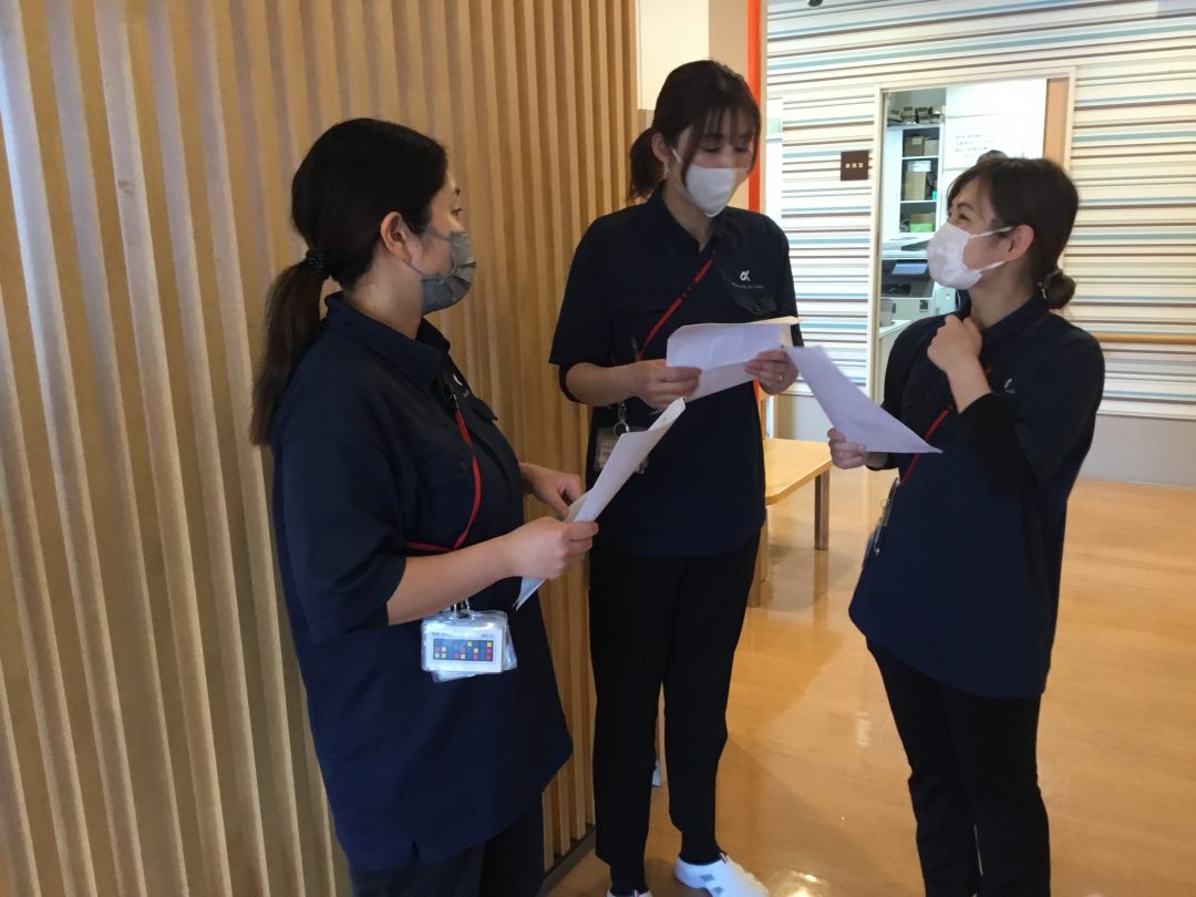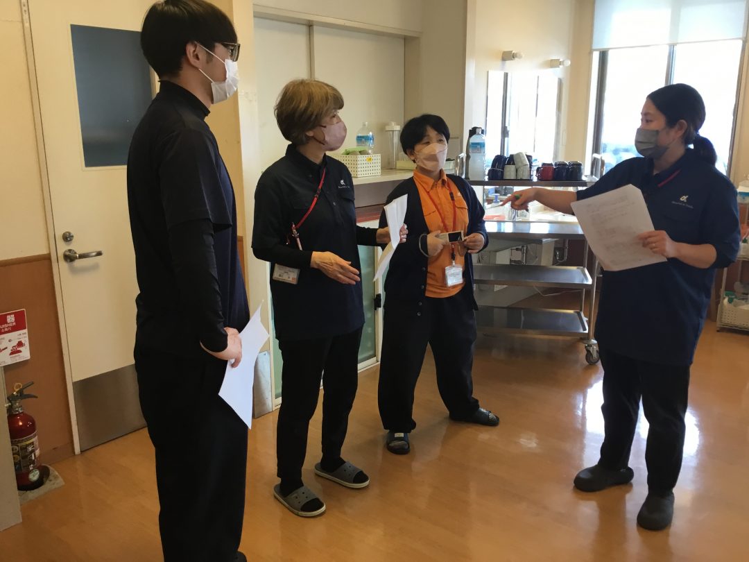 安全に行えるように災害委員会メンバーであんどうさん、やながわさんやまさきさんこうのさん4名は1か月前から計画し準備していました。当日、出勤スタッフに役割分担とご参加いただけるご入居者の役割を決めていきました。
