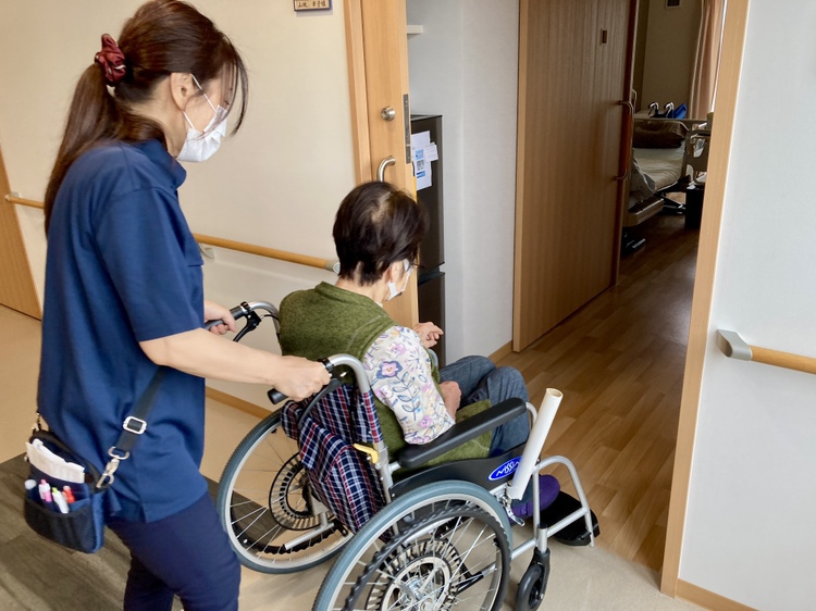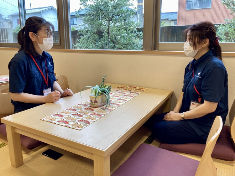 この春までは県内の老健(介護老人保健施設)で働いていらっしゃいました。介護度の高いご利用者が多く、大部屋を担当していたため苦労されたこともあったそうです。ただ、老健では、医療と介護の両面をみることができ、とてもいい勉強になったとお話くださいました。