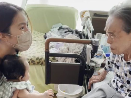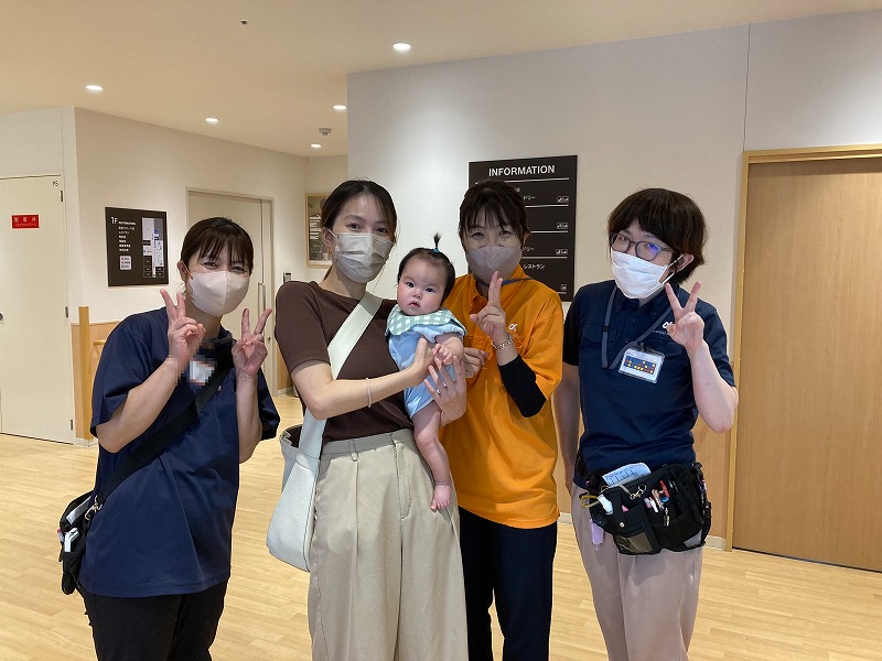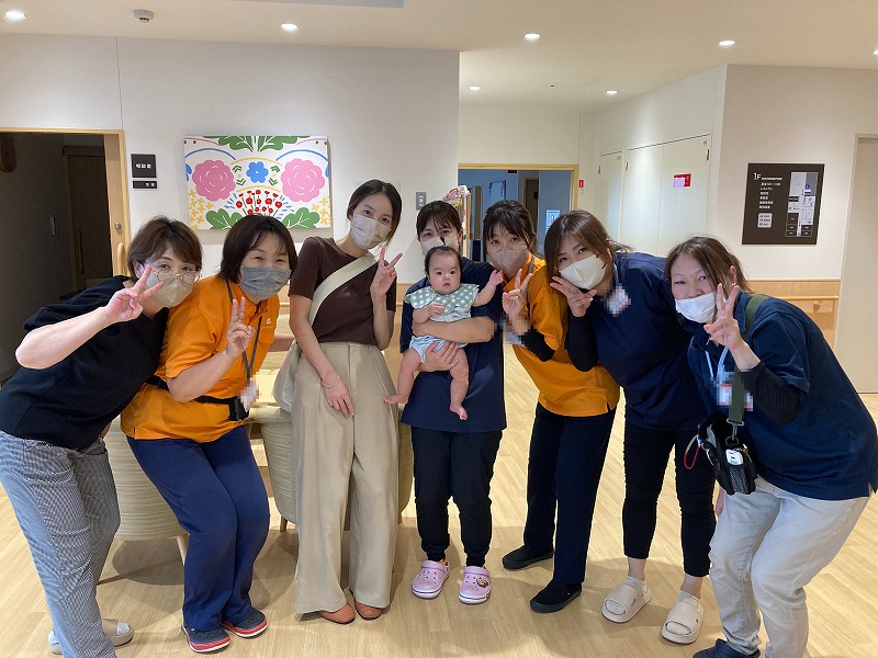 そんな中、1階のご入居者が「なんだか赤ちゃんのにおいがして来てみたら、なんとかわいい!」とフロアにお越になってくださいました。通りがかるご利用者の皆さんがほっこり笑顔になります。ぜひ産まれたら赤ちゃん見せにきてね。とおっしゃっていたA様は「ほんとかわいい~」と喜ばれています。