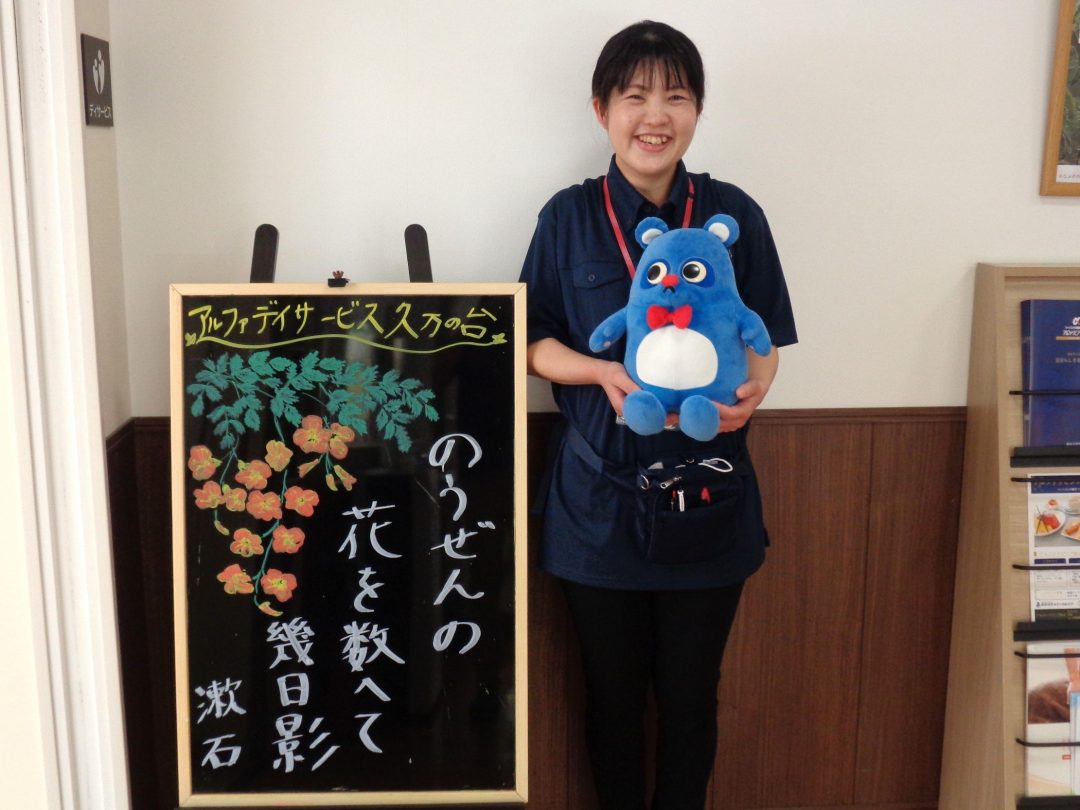 新しい仲間をご紹介します。7月より、アルファリビング松山久万の台デイサービスのスタッフとして勤務しているわたなべさんです。