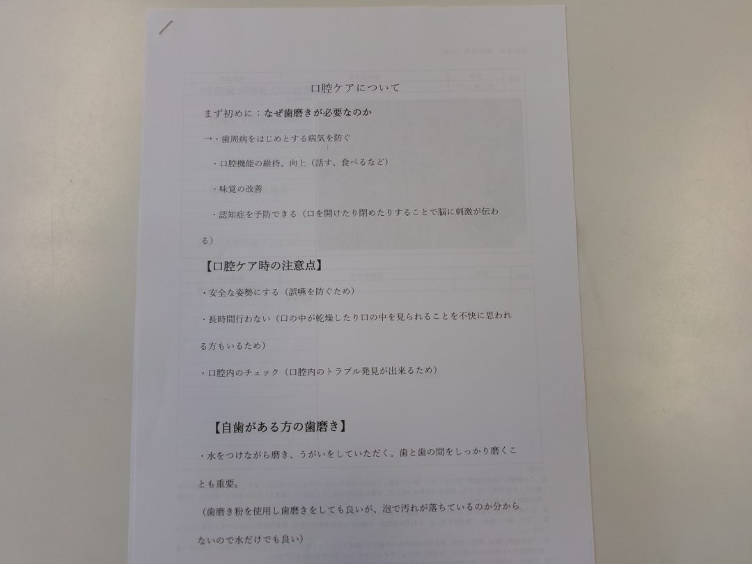 資料を作成するにあたって、往診に来られる歯科の先生から歯磨きの仕方をお聞きしました。新たな発見もあり、非常に勉強になりました。
