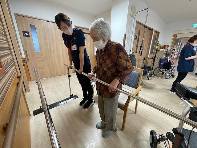 昨年の10月から機能訓練指導員による個別機能訓練を開始し1年が経過しました。平行棒を使用しての訓練(写真1)、椅子からの立ち上がりや屈伸・足上げなど(写真2)皆さま90歳過ぎているとは思えないほど意欲的に取り組まれています。