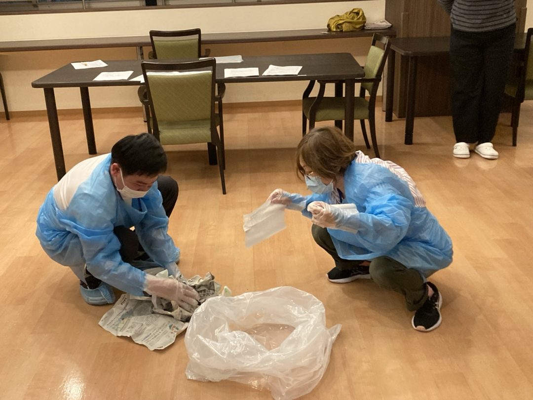 そのために訓練し、誰もが素早く安全に処理ができるよう準備をしておかなくてはなりません。研修では直接処理をする人と補助役の二人一組となり訓練スタート!