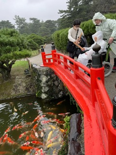 当日は残念な事に雨でしたが、準備をしていた雨カッパを着て栗林公園を散策。