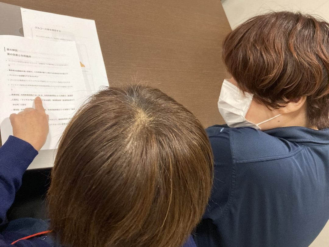 研修後も「そういえば、このインスリンとこのインスリンの違いはどこだった?」、「低血糖のときに飲むブドウ糖はどんな種類がある?」など、様々なことをスタッフ同士で話合っていました。この一つ一つの会話が、学びになっていきます。