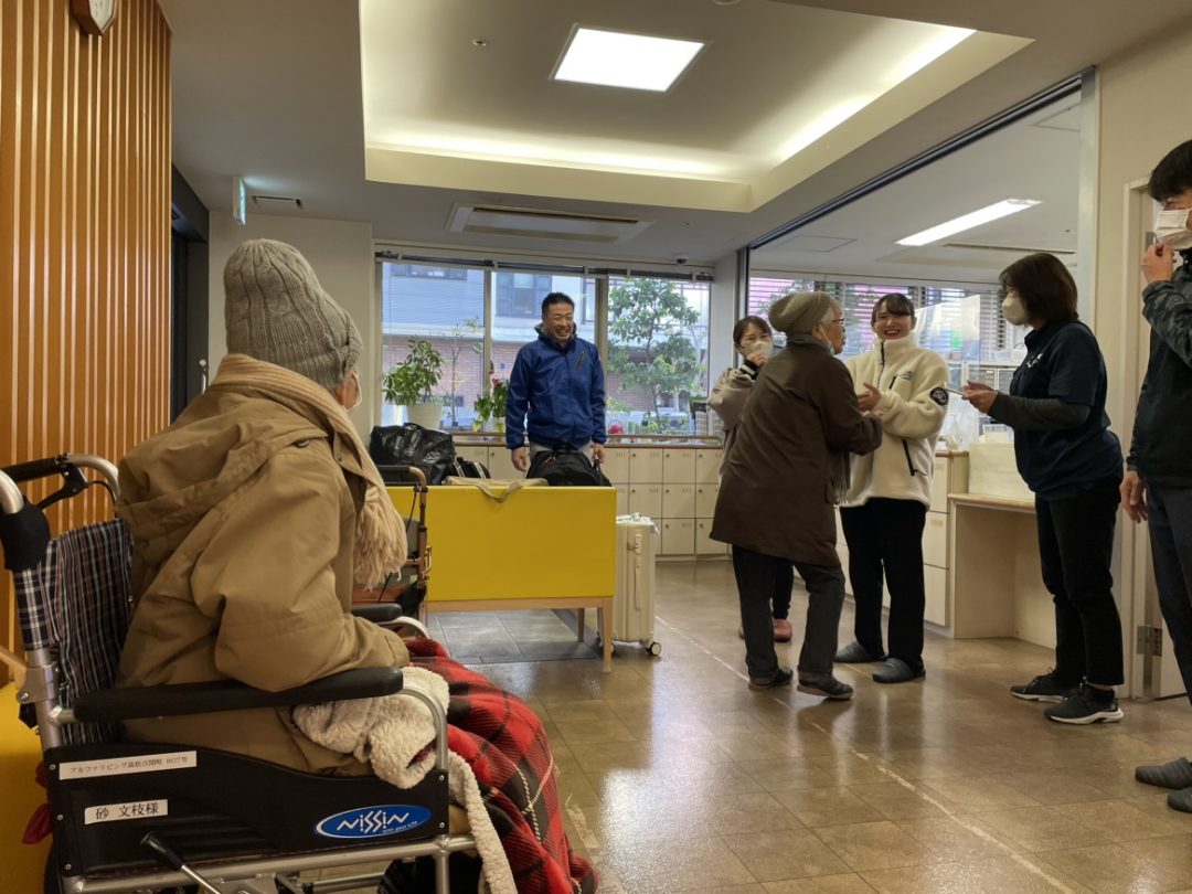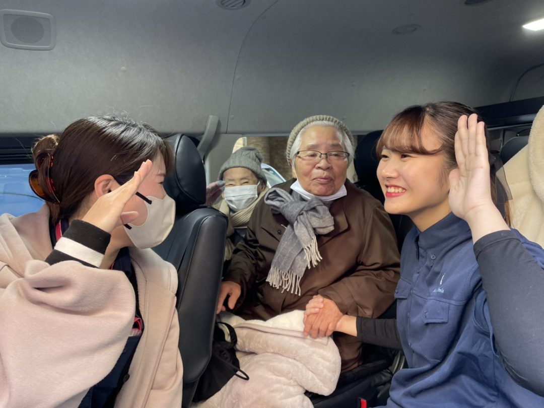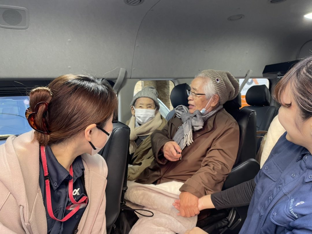 施設スタッフは添乗員と情報共有をしながら、ご家族との連携や旅行の準備を一緒に行ってきました。スタッフ皆がこの旅行を楽しみにしていたので、満面の笑顔で出発されるお二人から幸せのお裾分けをもらいました。お二人のワクワクした気持ち、車内での楽しそうな雰囲気が写真から伝わるでしょうか?