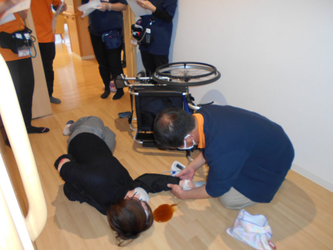 そんな中、さっきまで大声を上げていたA様が、急に気持ち悪いと嘔吐(コーヒーにとろみ剤を使用してよりリアルに!)。意識レベルも低下。
