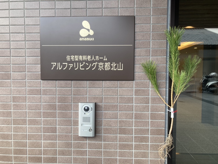 まず、根引き松!お正月に会社や店頭にはよく門松が見かけられますが、京都らしく、京都ならではの根引き松が施設正面玄関口に掲げられています。白紙に紅白の水引きで施設長のセンスが光ります。