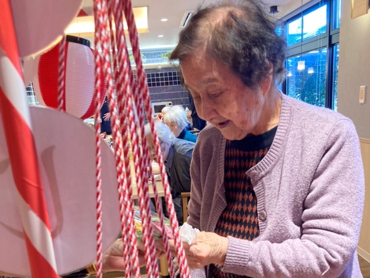 この後は、割ってお湯を注ぐとなんと、小さなアラレや、ゼリーの形で分かるおみくじが入ったおしるこでおもてなし。ご利用者のにこやかな笑顔が見られました。