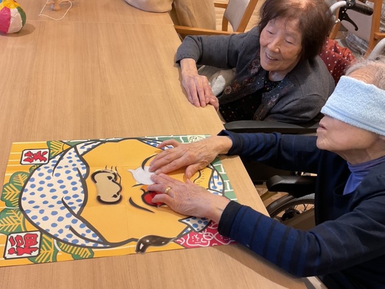昔、ご利用者が遊んでいらしたけん玉・お手玉・福笑い・だるま落とし・おはじき・オセロやトランプゲームを楽しまれ、賑やかなお声が飛び交っていました。