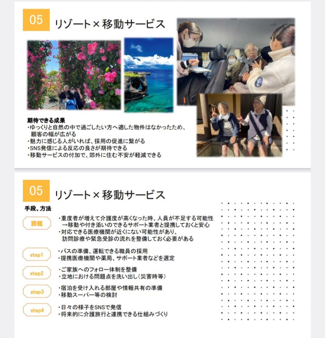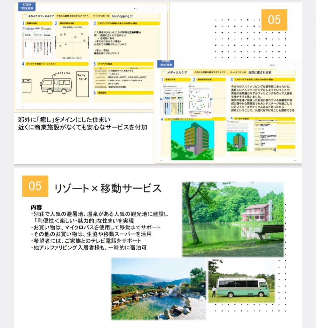 弊社からこのプロジェクトに参加しているのは、アルファリビング高松百間町のいたくらと、看護スタッフのおおうらさんです。2024年12月に生徒さんから、課題解決のための提案・アイデアについてプレゼンを受けました。生徒さんが考えに考え抜いてくださった提案は、計16案(すごい!!)。