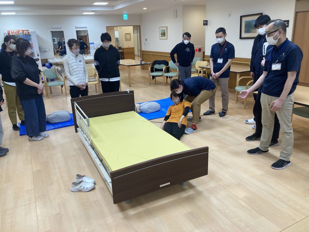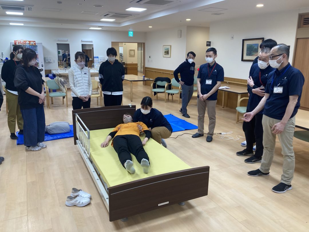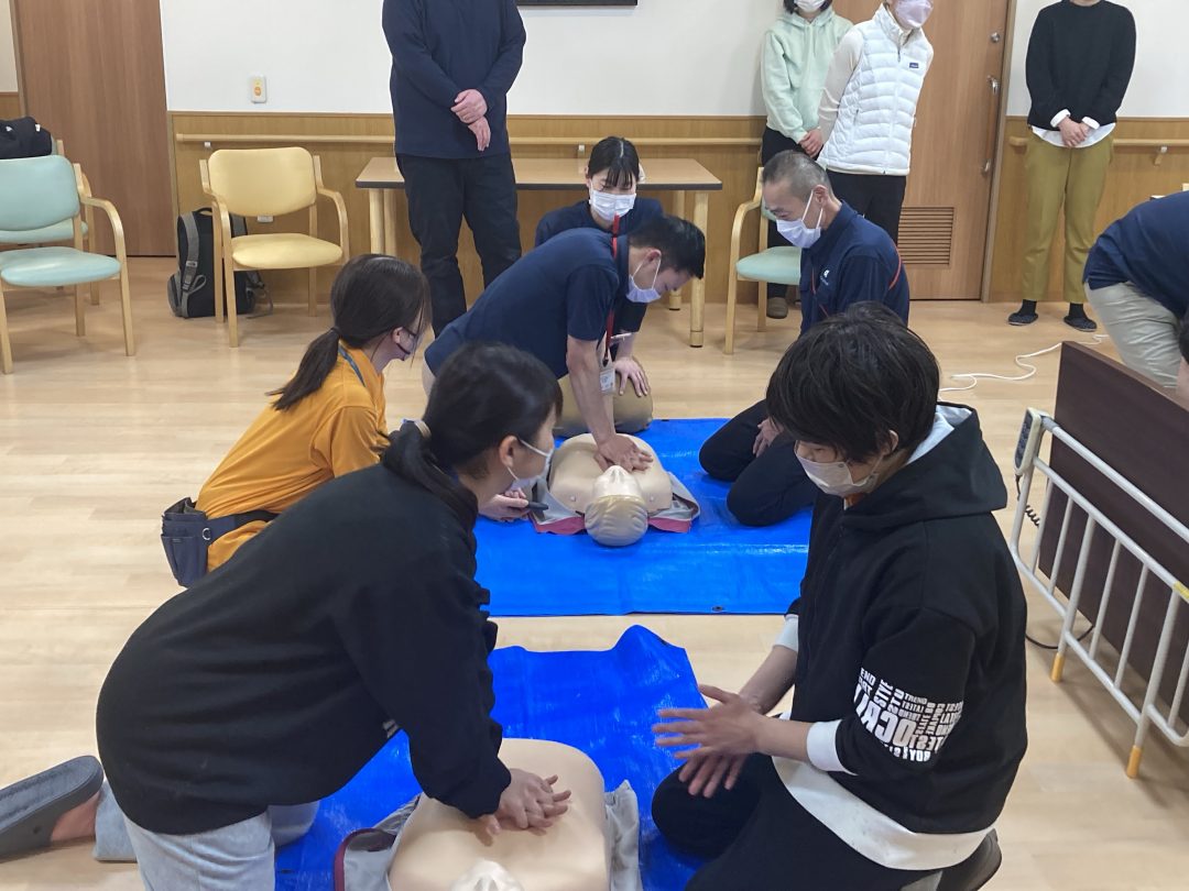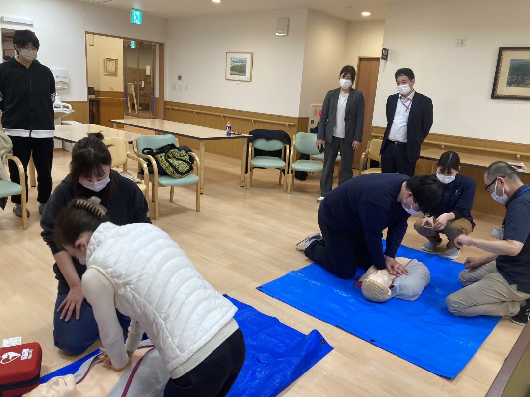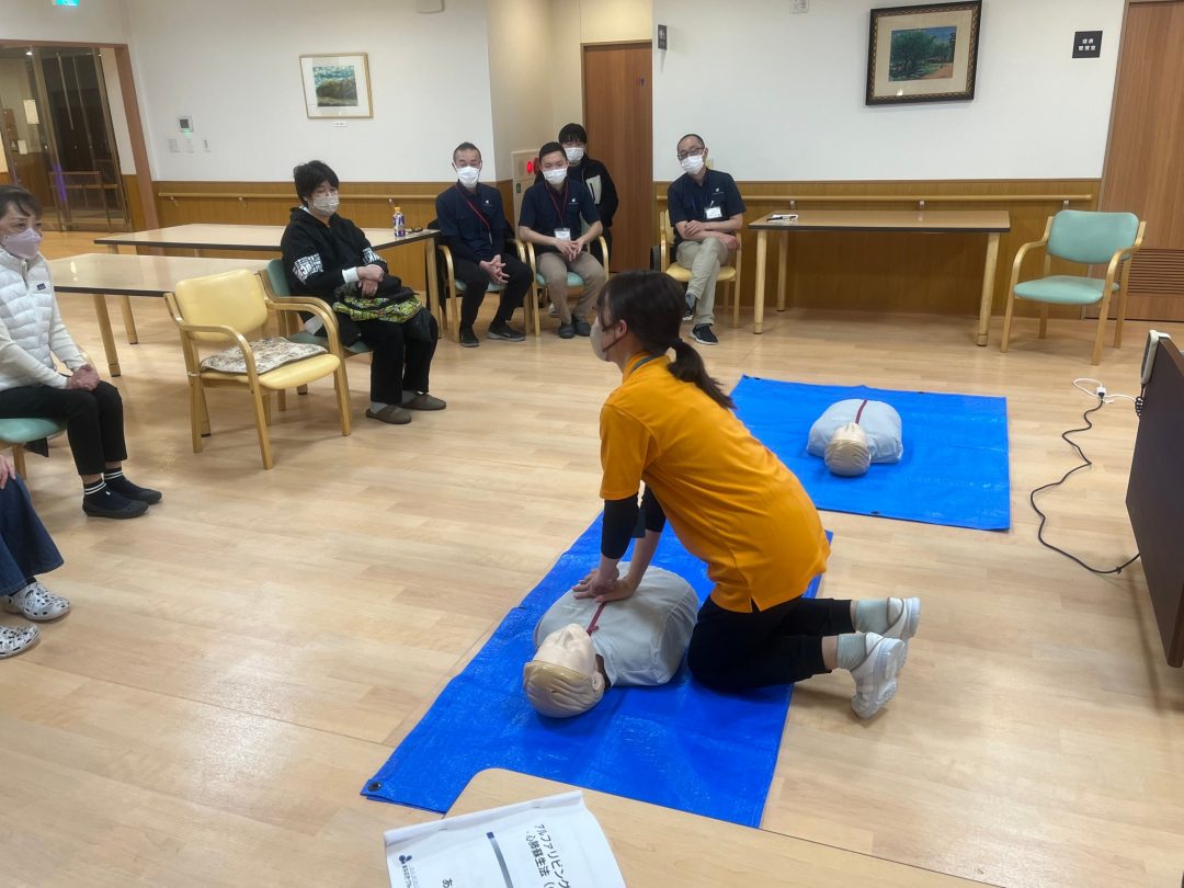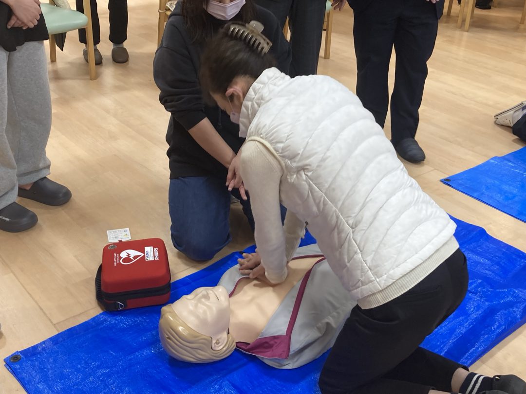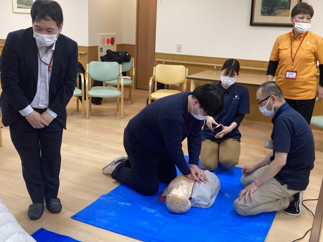 広島エリアでは、容態の急変に対応できるよう、できる限りスタッフに参加してもらい、心臓マッサージ(胸骨圧迫)ができるようになるという目的で開催しました。