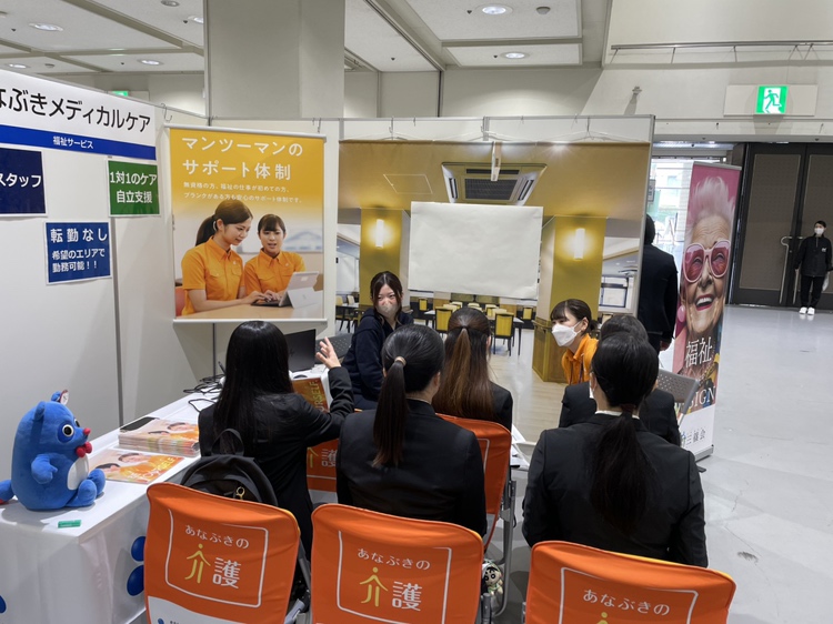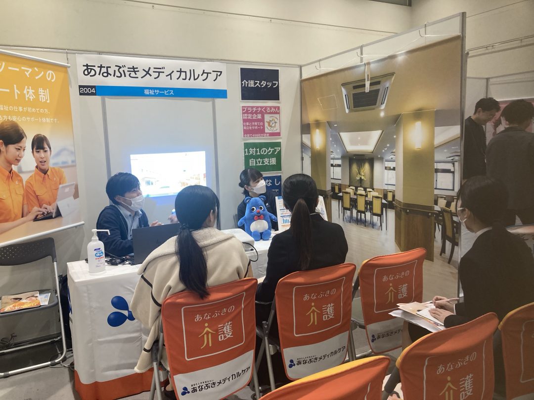 そんな合同説明会ですが、福祉業界以外の会社が多い説明会(ブース)では、訪問者がいない時間が長かったです…。ただ、みんなで声をかけたりしてなんとか12名の方が着座してくださいました。