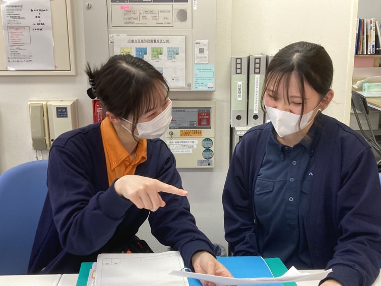 いけださんは当社に入社してまだ日も浅く、先輩スタッフのたけもとさんに教わることも多い日々です。