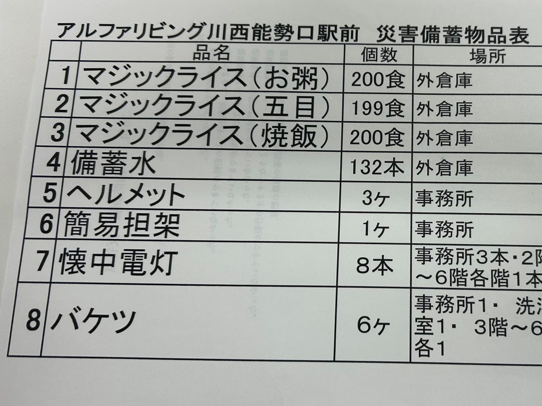 今回の話し合いで議題に上がったのは災害時の備蓄物品です。現在アルファリビング川西能勢口駅前に備蓄している物品とその数を改めて把握し、数が足りない物品やその他必要な物品がないか話し合いをしました。