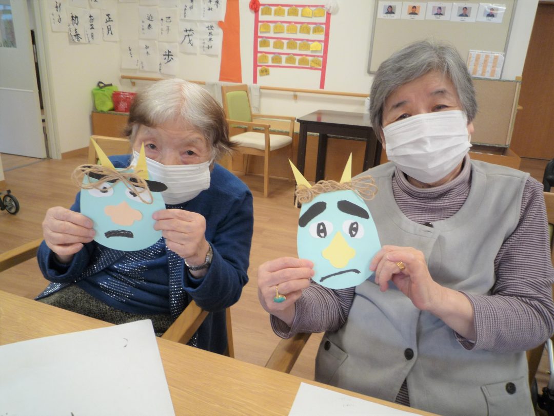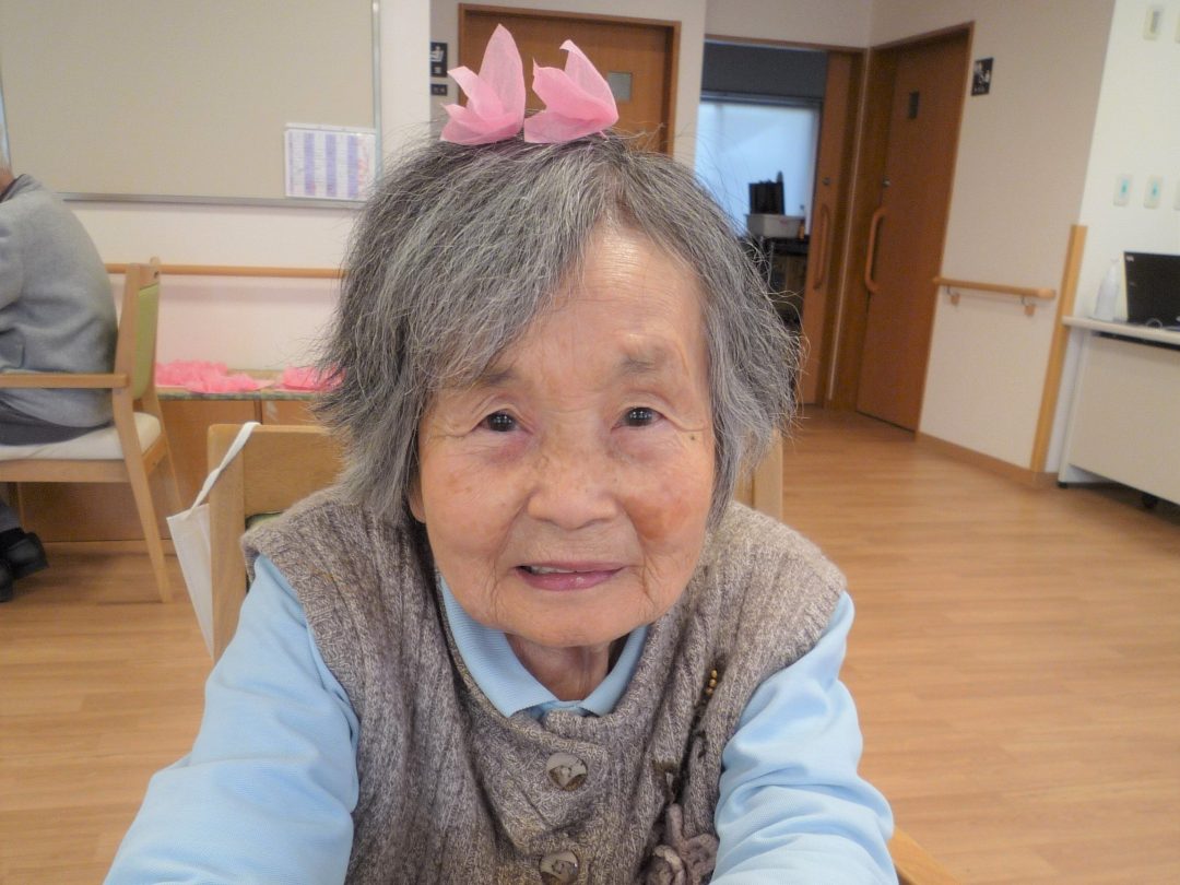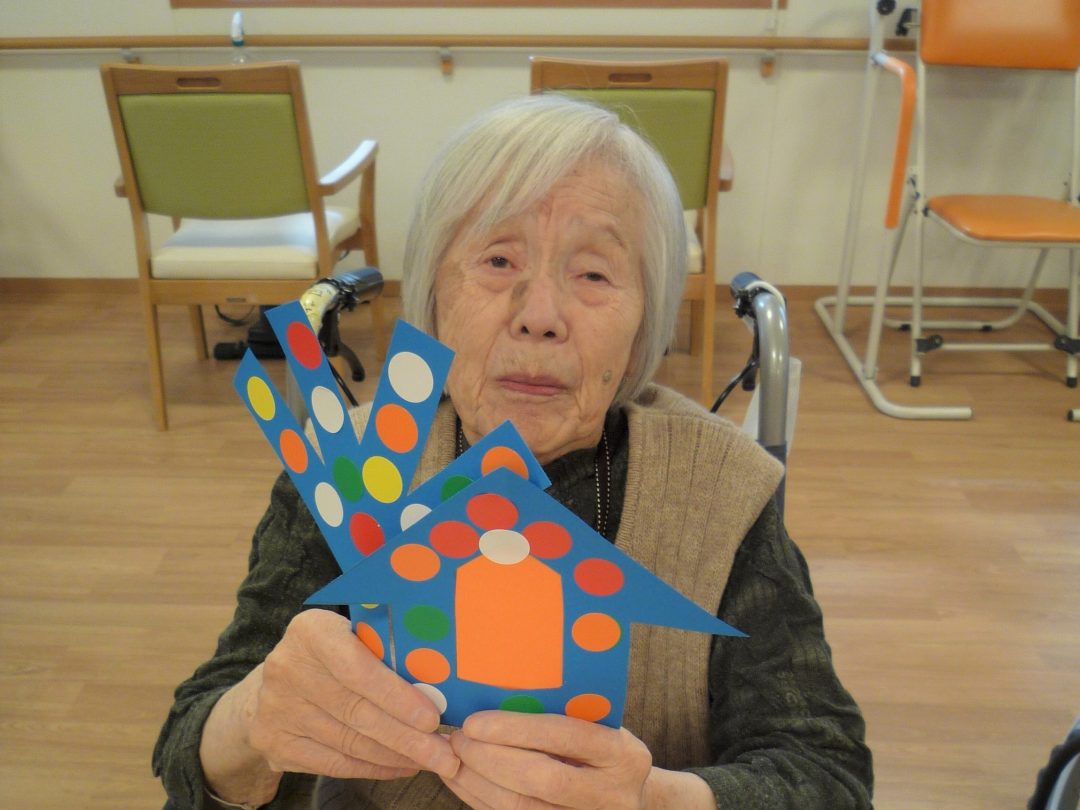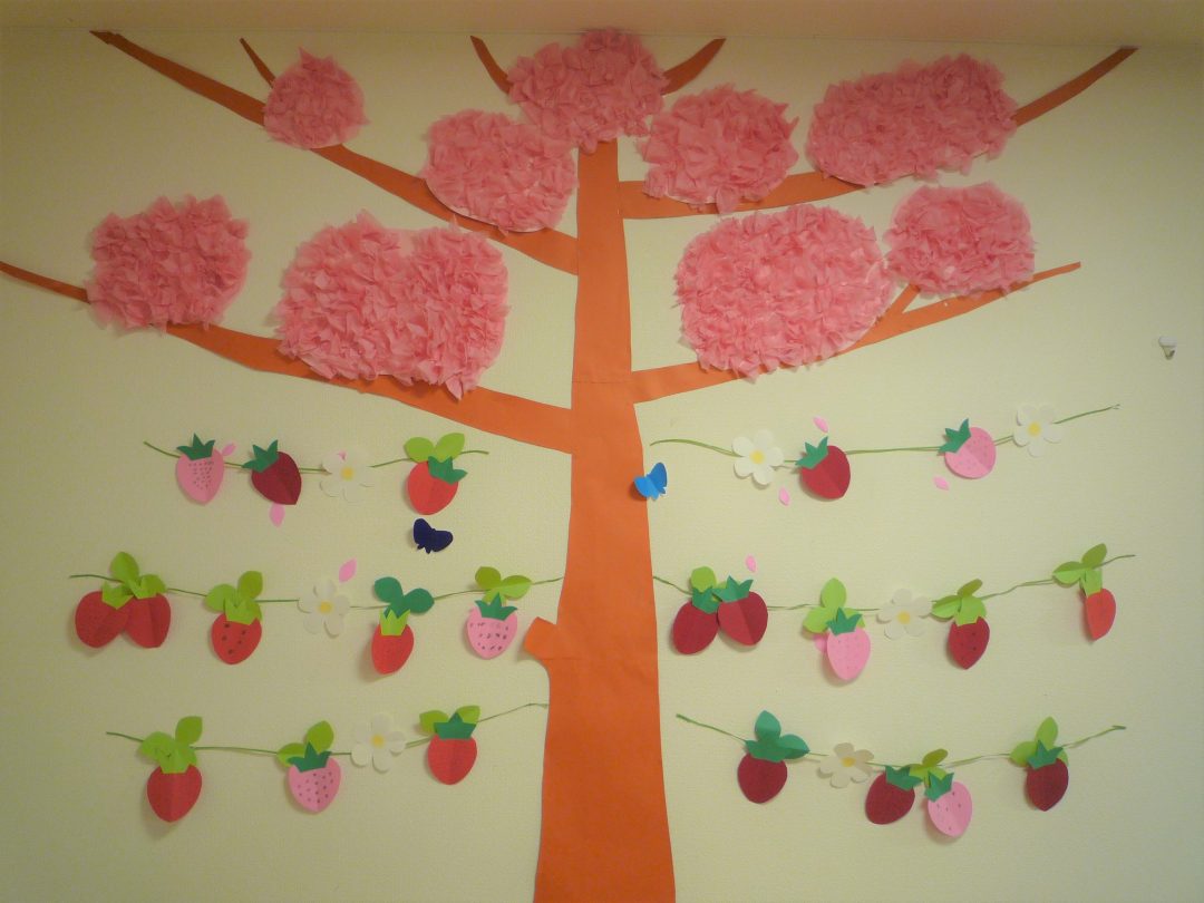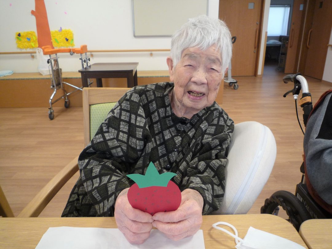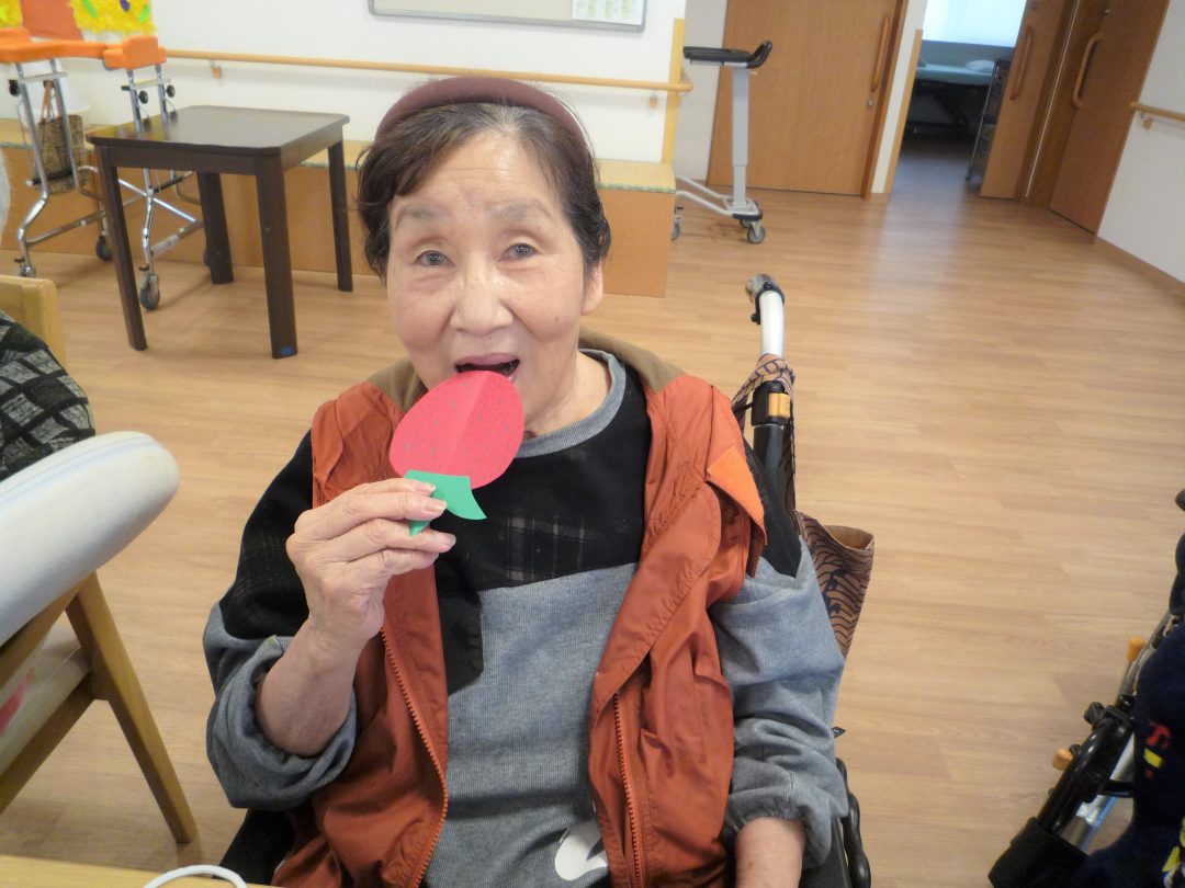 作った制作物はデイルーム内の壁面に展示しています。今月の制作は、おいしそうなイチゴです。皆さんハサミやのりを器用に使って、作ってくださいました。 葉っぱと花も作って飾りつけると、とてもかわいい壁面になりました!