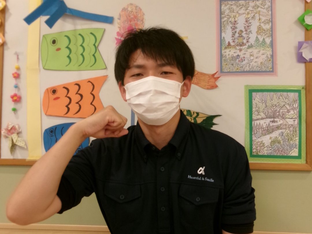 どうしても、介護現場の世間一般的なイメージは、「女性スタッフがほとんど」だと思います。そんな中、うれしくありがたいことに、今年の3月、男性スタッフが中途採用で来てくださいました。ふじいさんです。