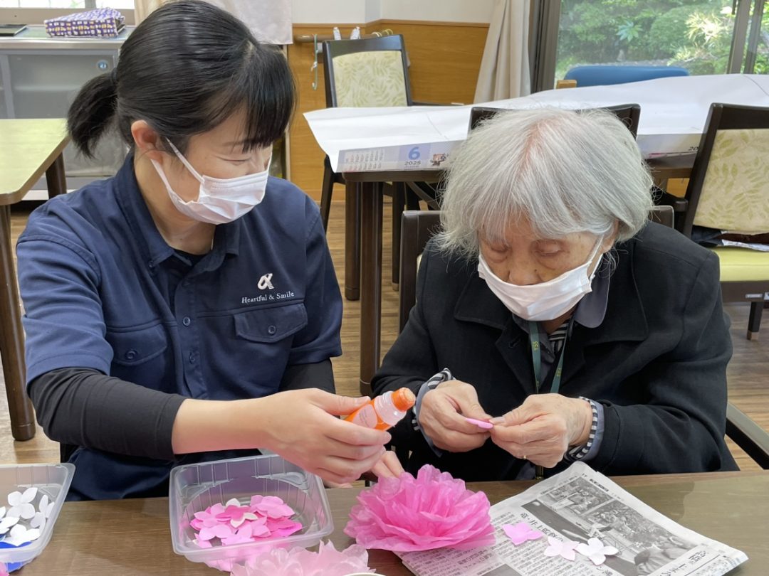 季節の作品作りでは持前の手先の器用さを発揮され、ご利用者と一緒にできる作業を考えてくれています。生け花や刺しゅうもお得意なようでステキです!