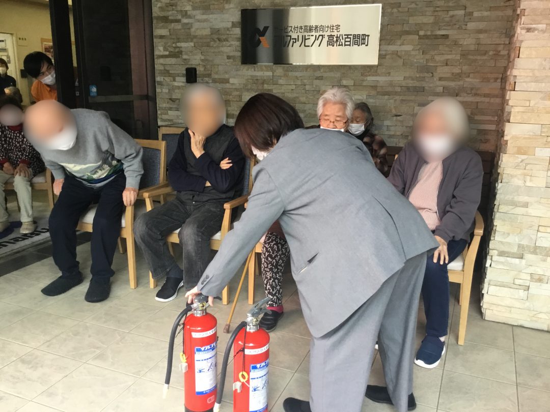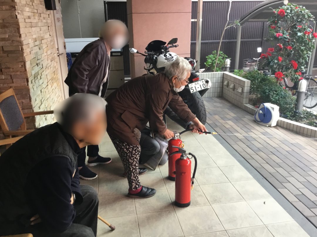 非常階段を使用した訓練への参加が難しい方も、消火訓練には多くのご入居者が参加してくださいました。手順説明を行い、水の入った消火器を実際に使用していただきます。消火器を触ってみると「結構重いんやね!」という声もちらほら聞かれ、体験したことで得られる知識や感想を共有しました。