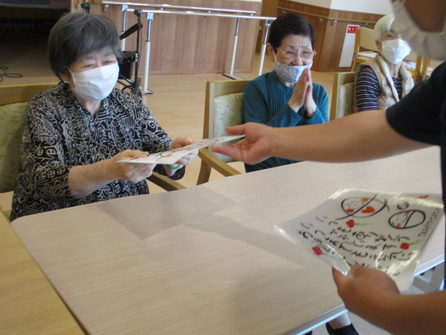 ご利用者の皆様は「かわいい」「上手に書いとるね」「部屋に飾るね」と喜ばれておられました。