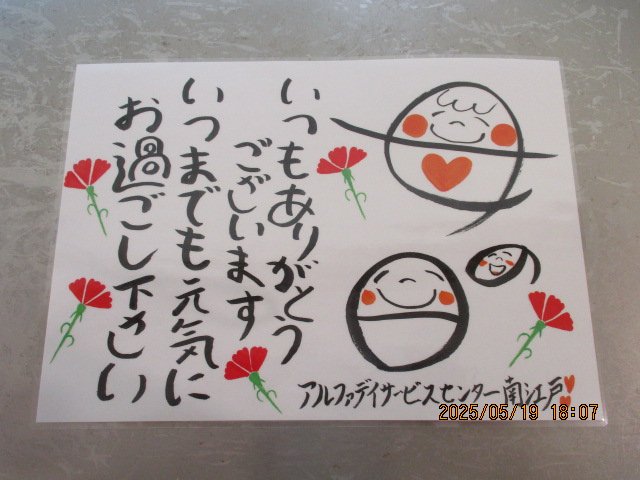 今年も母の日がやってきました。デイサービスでは日頃利用されている方に、母の日にちなんだ何かをできないかスタッフと検討し、メッセージカードをプレゼントすることになりました。