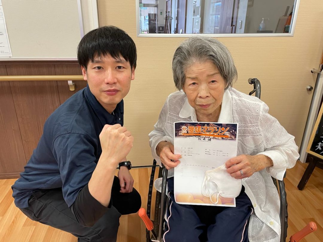 少し時間が経ってしまいましたが、毎年2月に開催される“愛媛マラソン”に今年も無事に出走することができました。毎年レース前になるとテレビでCMが流れるので、ご入居者から「マラソン頑張ってね」「何番でゴールするの」と言われるようになります。