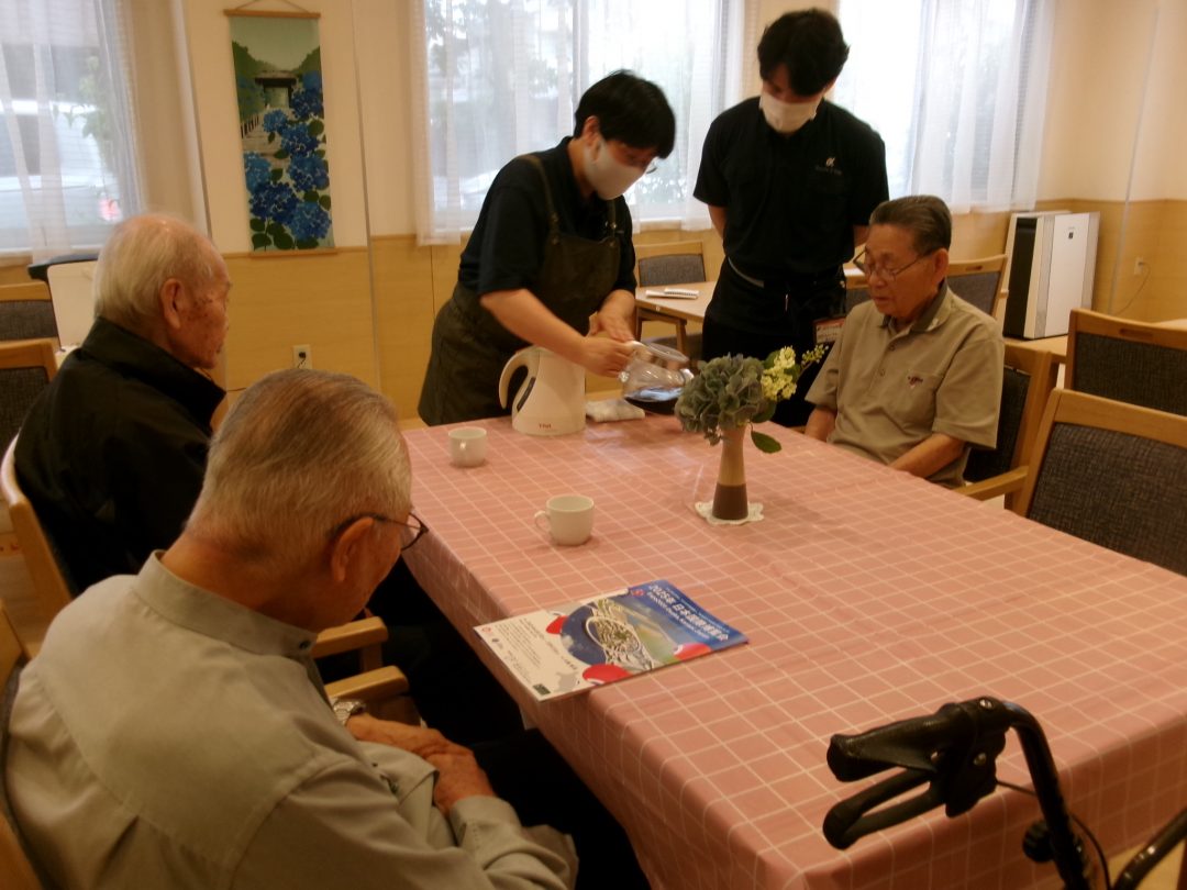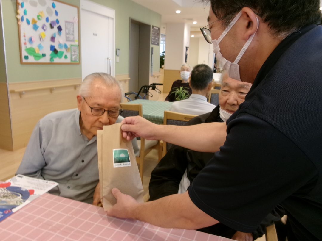 そして第1回目のコーヒーイベントが始まると、レストランに降りてこられたご利用者の顔が、みんな「いい表情」をしていました。参加者はみんなコーヒー好き!そりゃいい顔しますよね♡。父の日ですから、最初のグループは全員男性のご利用者にさせていただきました。