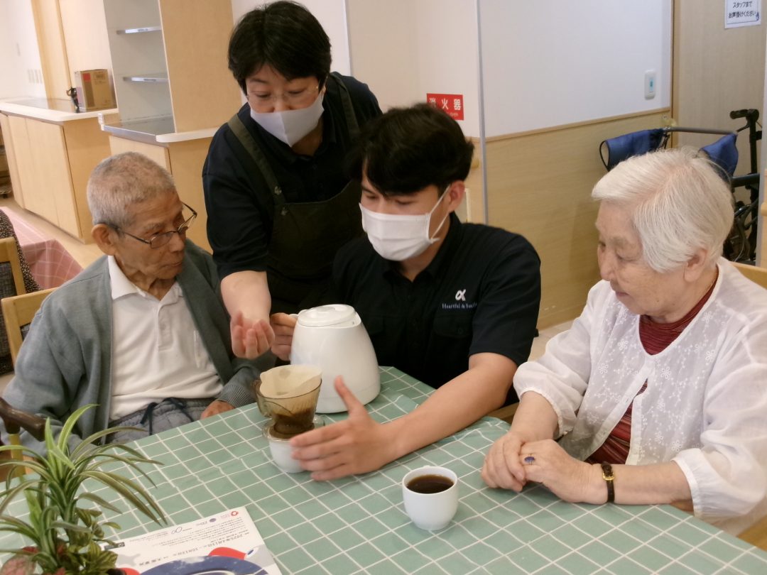 コーヒーを淹れていくと、徐々にレストラン全体がコーヒーの香りで満たされていきます。ご利用者様たちも自然な笑顔で談笑され、当日のスタッフの協力もあり、どこかいつもと違う雰囲気でした。