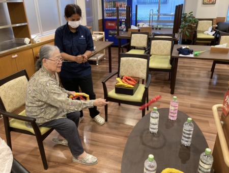 ペットボトルめがけてリングを投げますが、簡単に見えて意外と難しい!