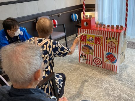 夏祭りを通して、日常とはまた違った、とても活気ある空気感がありました。普段はあまり話す機会の少ないご入居者同士がおしゃべりしながらお食事されていて、新たなコミュニケーションの場になっていることもうれしく思いました。