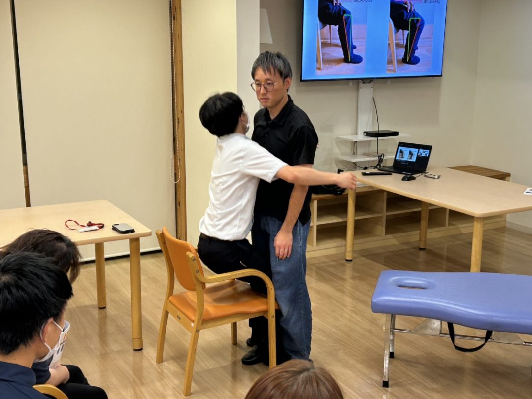 研修では、実際のモデルを用いたデモンストレーションも行われ、参加したスタッフたちは真剣な眼差しで学びを深めていました。 「どうすれば相手にとって自然な動きになるのか」「自分の身体をどう使えば負担が少ないのか」―― 一つひとつの動作に意味があることを体感しながら、技術の向上に努める姿が印象的でした。