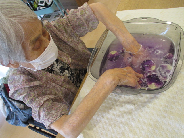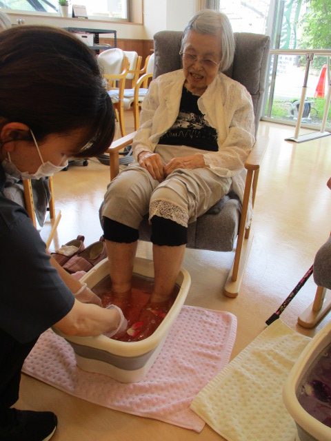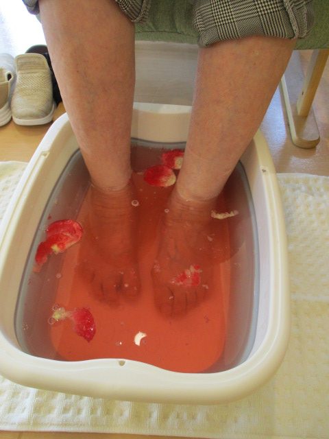 その中の触覚プログラムとして手浴、足浴を行いました。ご利用者の中には足浴が初めての方、何十年ぶりの方などがおり、足浴、手浴とも大変喜んでいただきました。