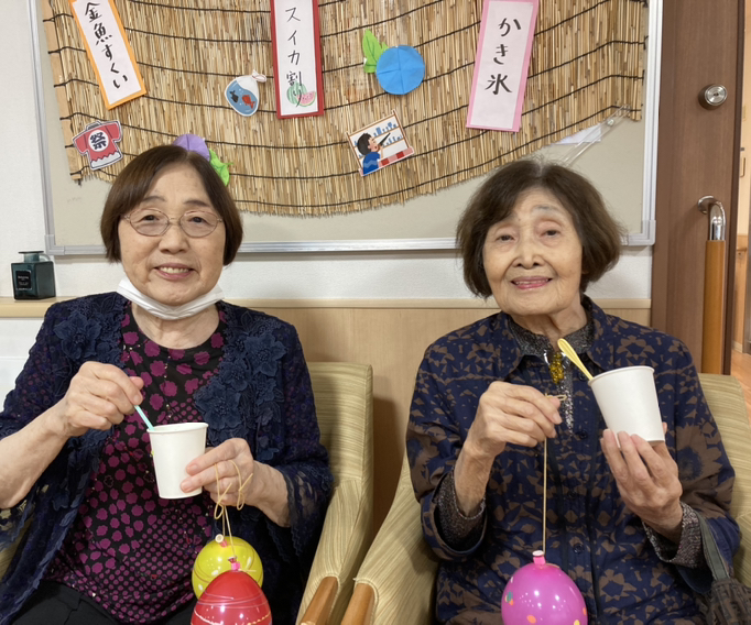 今年の夏祭りレクリエーションでは、DSスペースを使用し日中はボンボンすくいとかき氷をしました。ボンボンはぬるぬると動きなかなかとるのが難しくご利用者の皆さま、大変苦戦している様子でした。ボンボンで集中した後のかき氷は、疲れを癒す効果があったようで、笑顔をみせていただきました。
