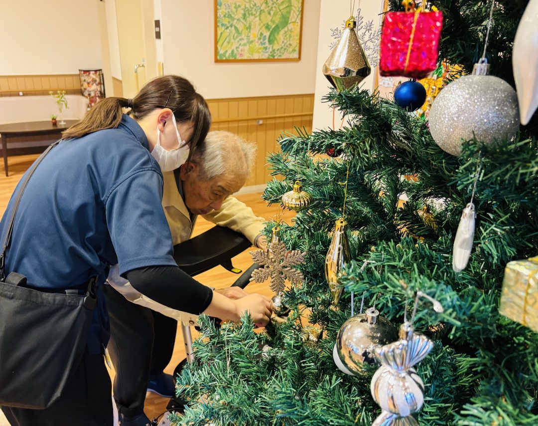 エントランスに飾るクリスマスツリーは、今年もご入居者の皆さまと一緒に飾りつけ。