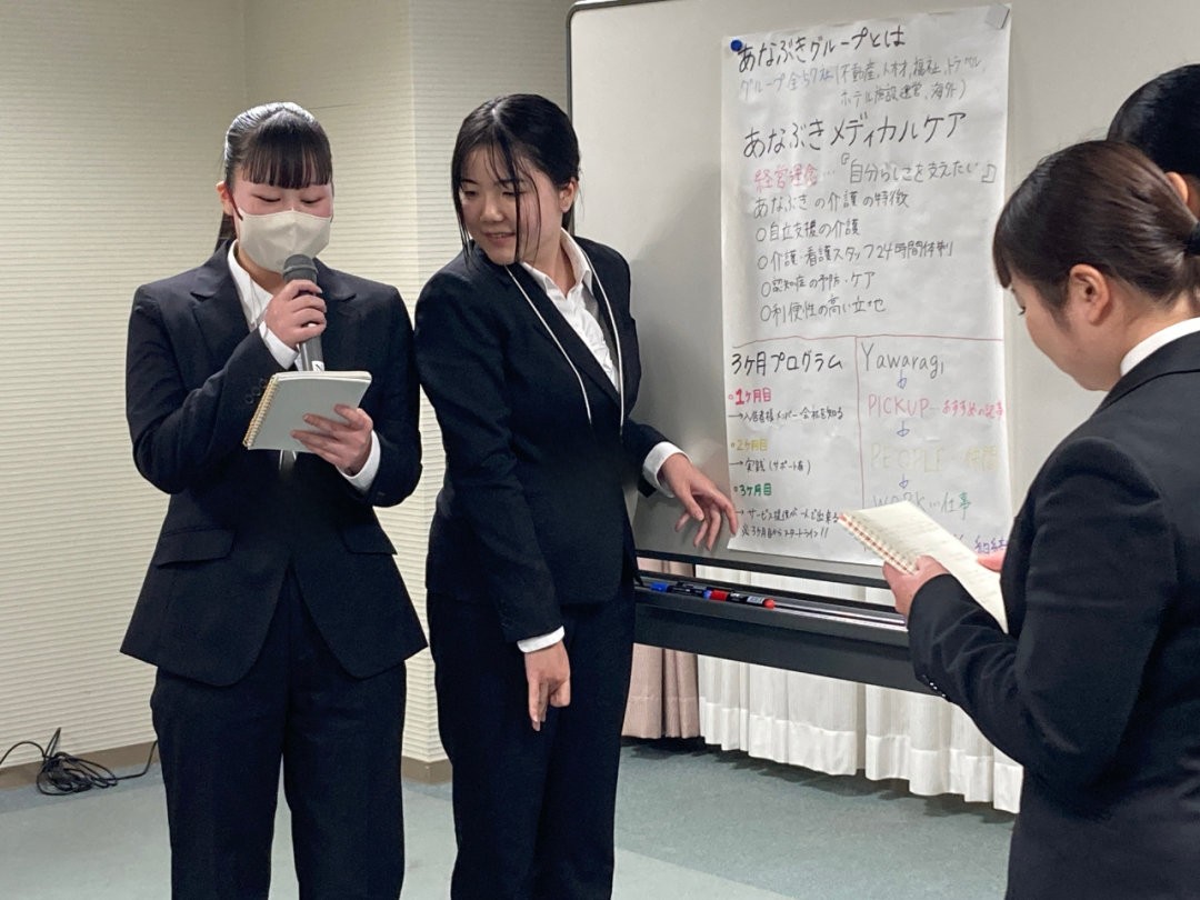 1日目の研修では、「あなぶきメディカルケア」について理解を深めることを目的に、班ごとに調査と発表を行いました。インターネットやホームページ、リクルートサイト、Web社内報Yawaragi、Instagram、パンフレットなど、さまざまな媒体を活用しながら、会社について多角的に情報を集めていきます。
