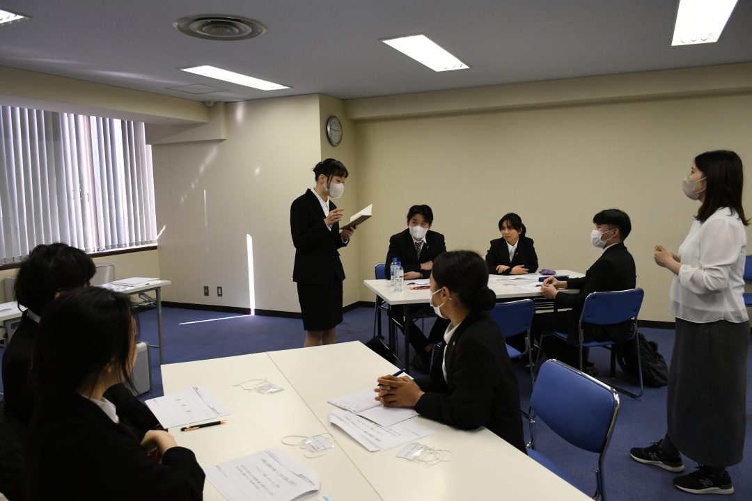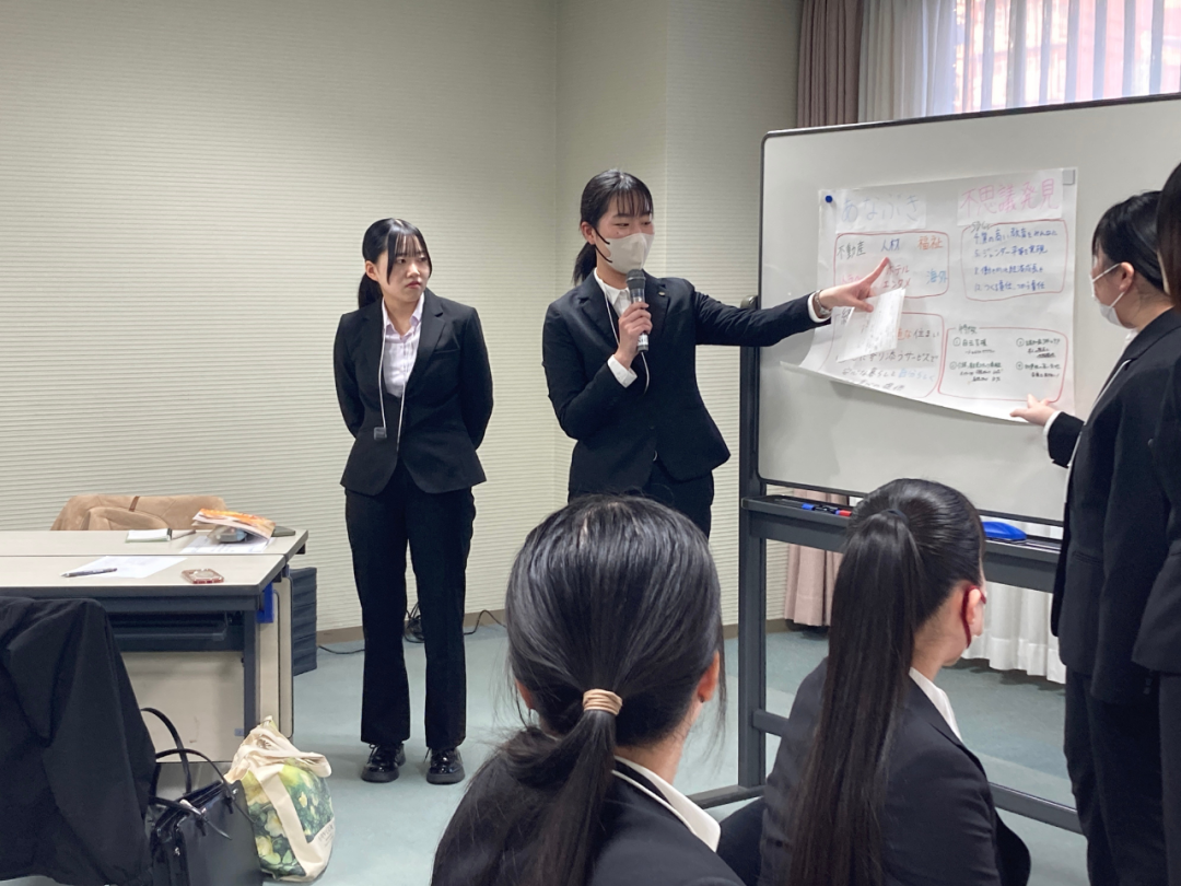 会社概要や事業内容、福利厚生、企業理念など、それぞれの班が調べた内容を模造紙に丁寧にまとめ、発表しました。