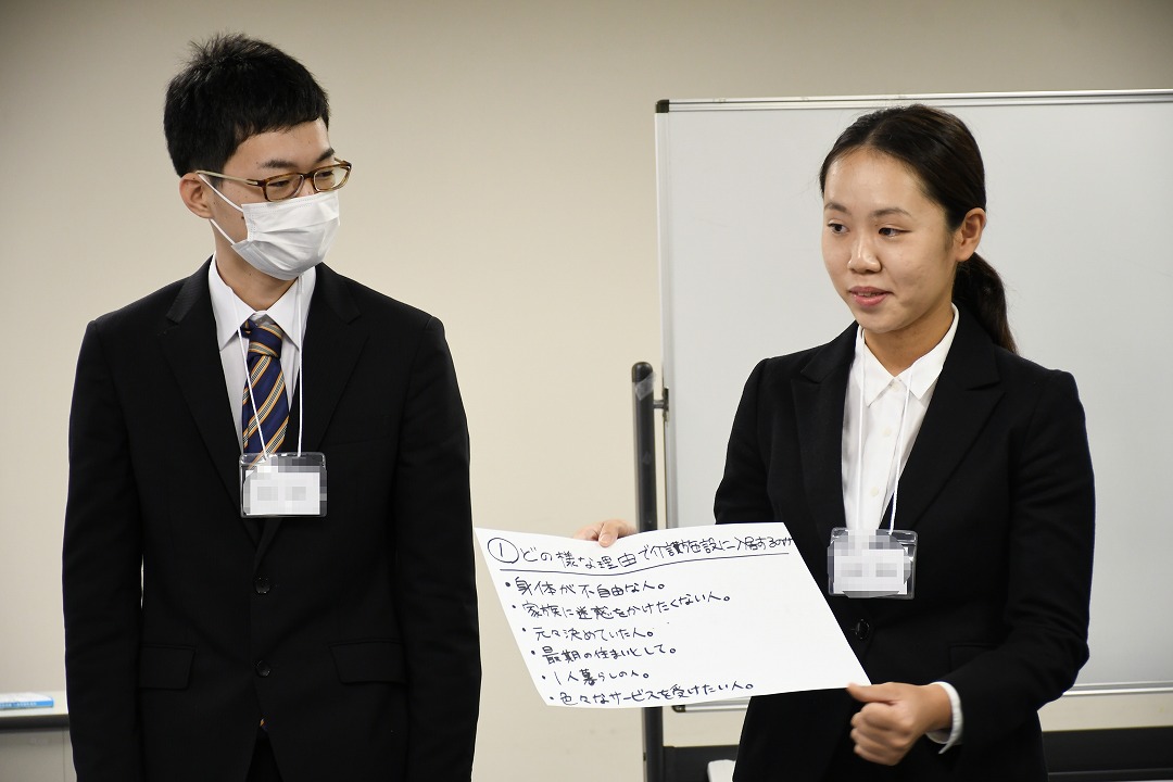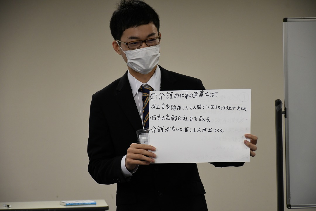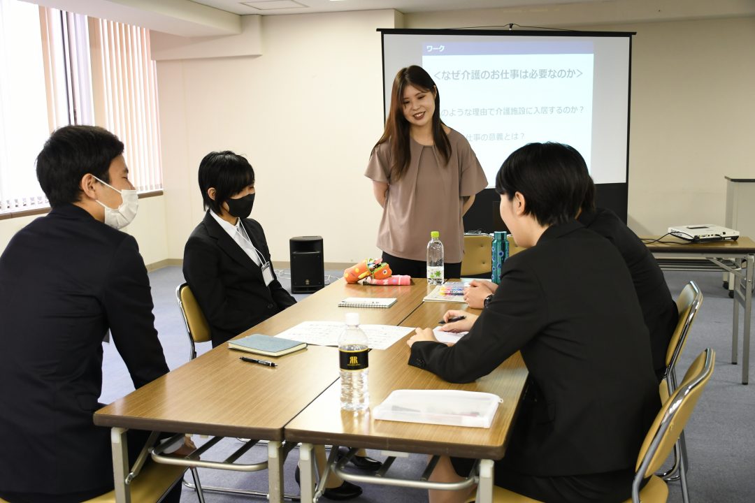 その後、採用チームのはしもとさんの進行で「なぜ世の中に介護のお仕事が必要なのか」についてグループワークをしました。