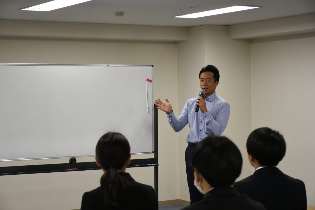 研修の後半では、採用チームのひぐまさんから「あなぶきグループ・あなぶきメディカルケアについて」のお話をさせていただきました。