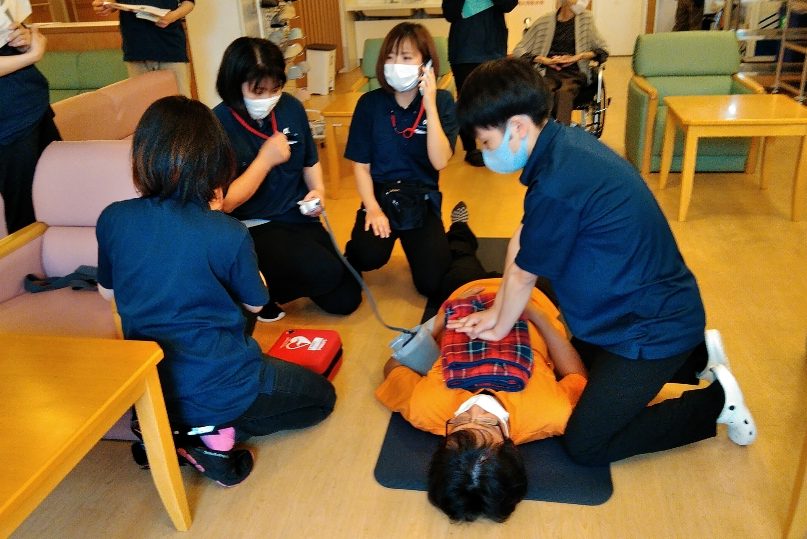 今回は、看護スタッフのうえださんが、緊急時対応の研修を行いました。