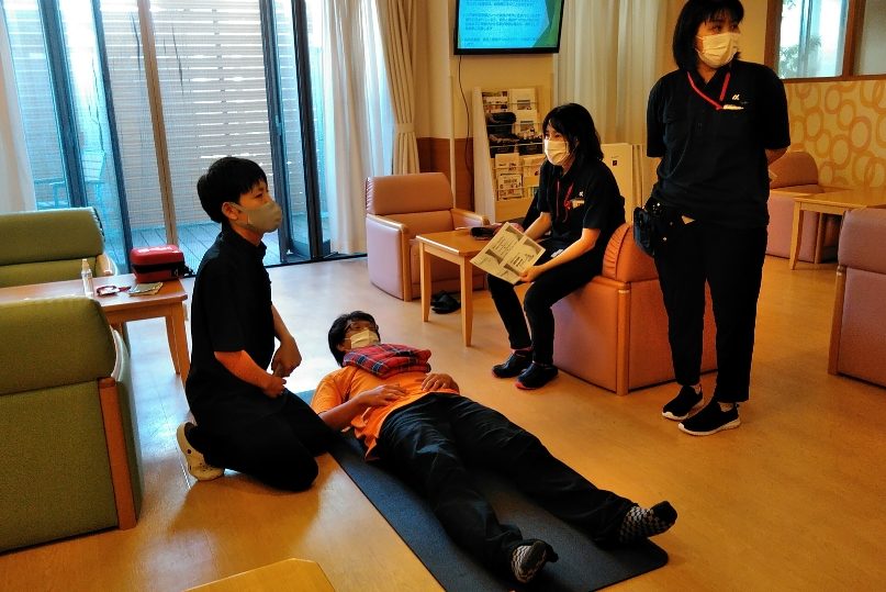 心臓マッサージの手技方法を伝える場では、うえださん自らがご入居者の役となり、しっかりと心臓マッサージのやり方を他のスタッフに伝えました。