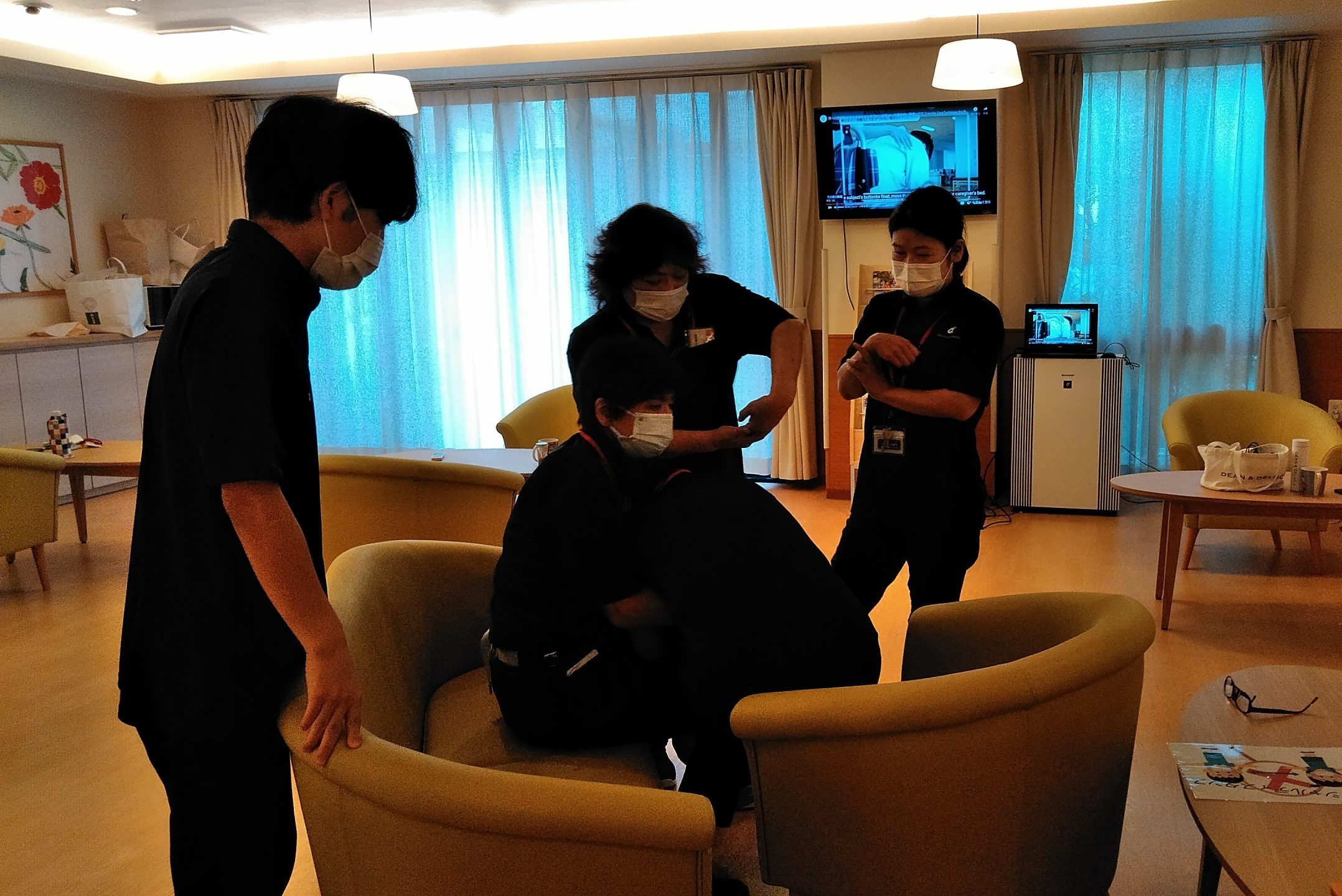 今まで行ってきた移乗方法とは違う内容であったことに興味津々で、その時いたスタッフがお互いを練習台として、移乗の練習を初めて大盛り上がり。
