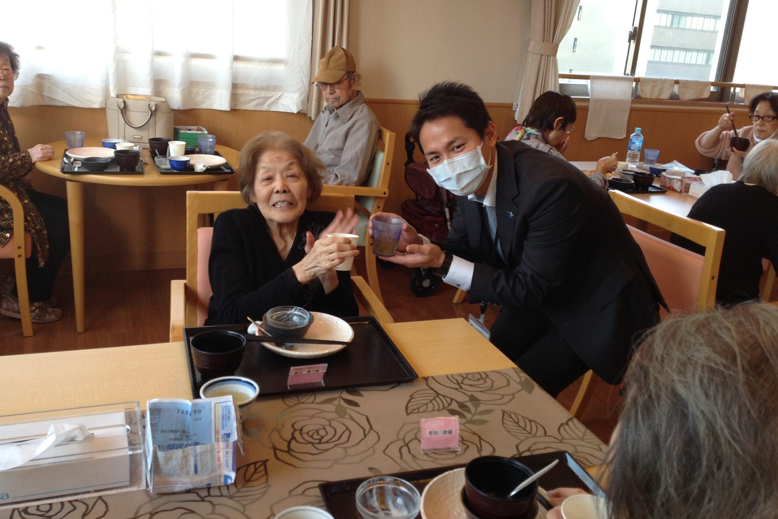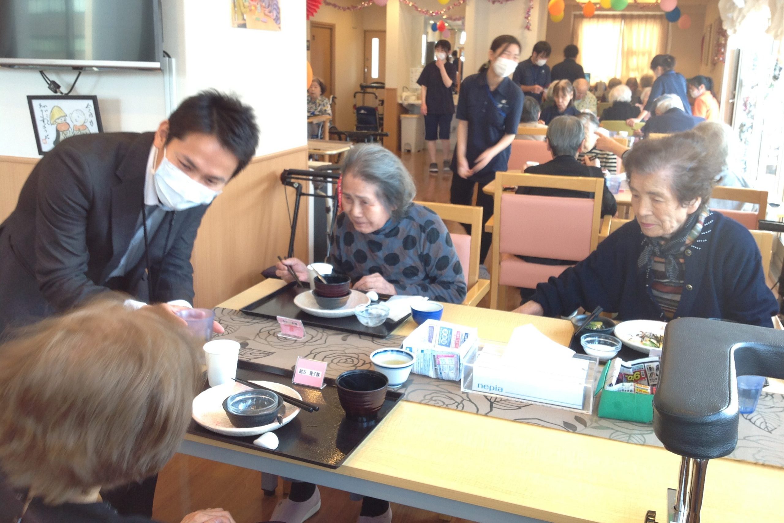 「あなたも頑張りなさいよ~。」と激励のお言葉をいただきながら、各テーブルのご入居者にご挨拶しつつ、皆さんとお話をすることができました。
