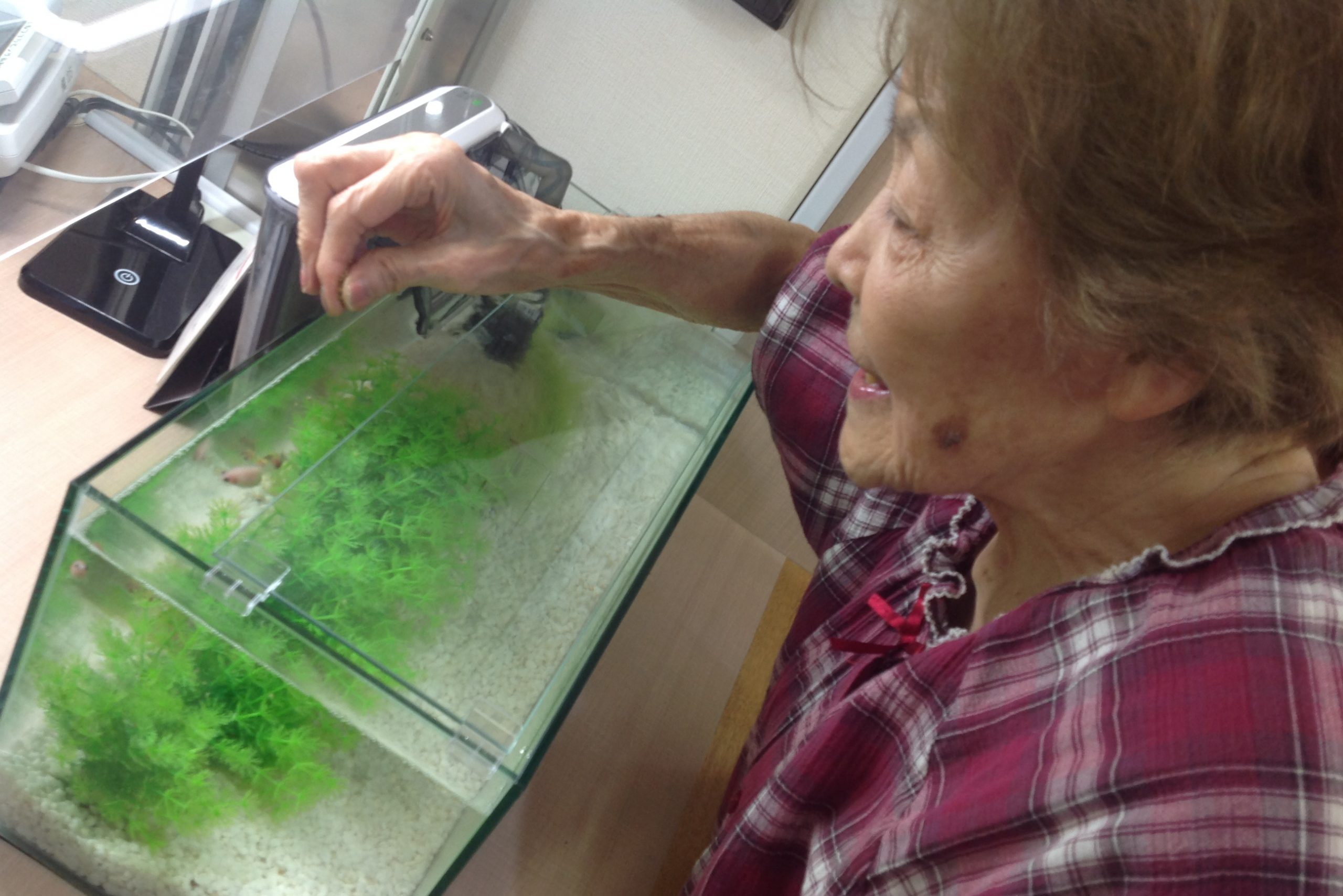 ご入居者Aさまが1Fへ降りてこられた際、「生き物がいる。だるまメダカが可愛い。」と、目を輝かせながらジッと見つめられていました。