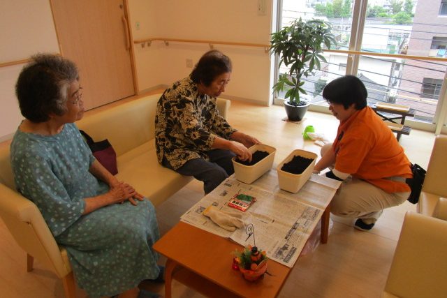 土いじりをしている最中はご自宅で菜園の話をされたり、他のご入居者とお話をされたりととても落ち着かれており、その場にいたスタッフも心がほっこり。